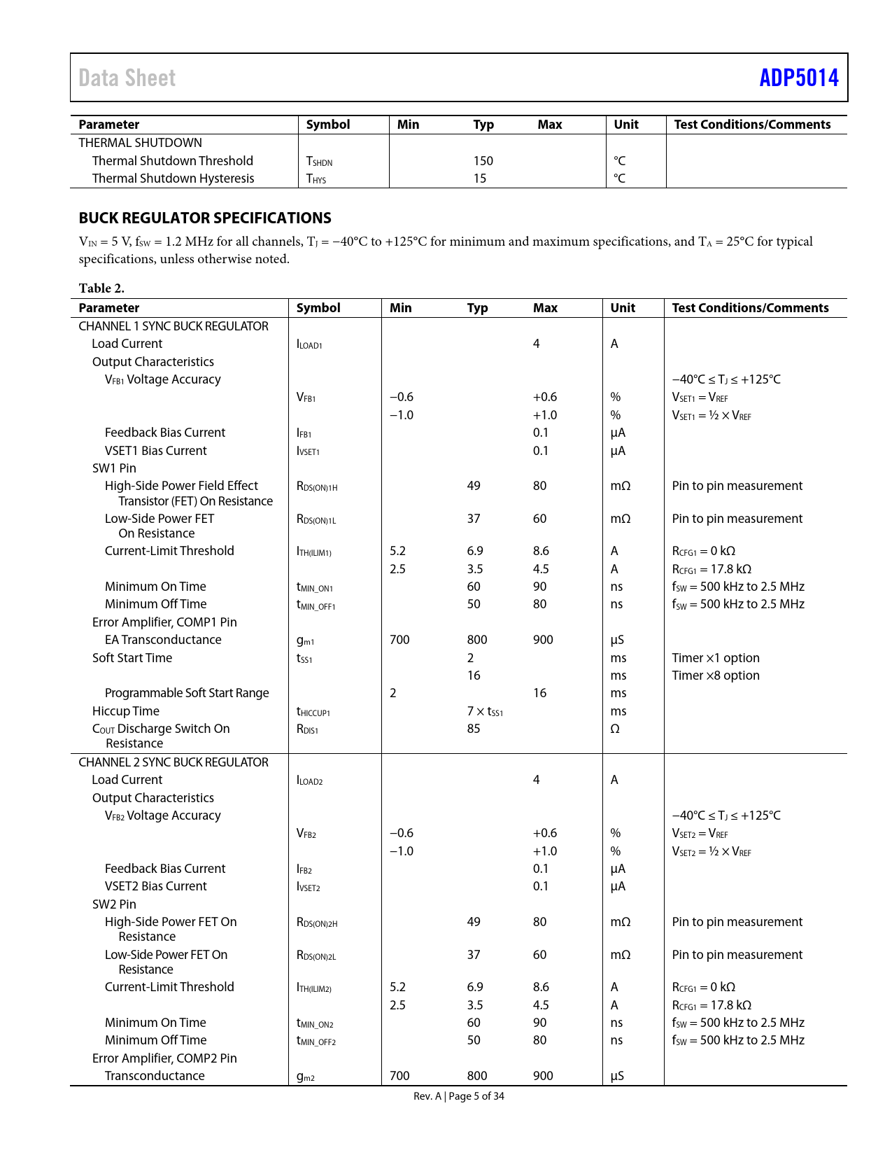 | 页数 / 页 | 34 / 5 — Data Sheet. ADP5014. Parameter. Symbol. Min. Typ. Max. Unit. Test … |