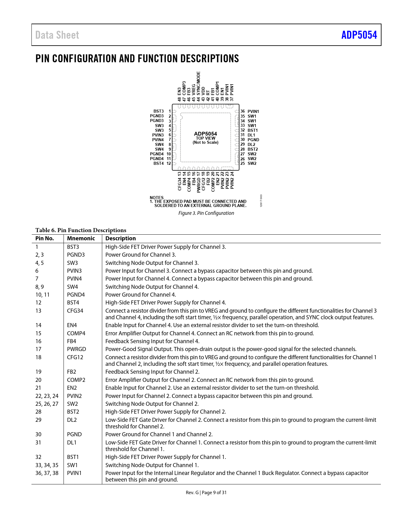 Data SheetADP5054PIN CONFIGURATION AND FUNCTION DESCRIPTIONSE D O3M/1PGCP113M3END1M1NI NINOBRYDTBONVVECFVSVRFCEPP876543210987444444444333BST3136 PVIN1PGND3235 SW1PGND3334 SW1SW3433 SW1SW3532 BST1PVIN36ADP505431 DL1PVIN47TOP VIEW30 PGND(Not to Scale)SW4829 DL2SW4928 BST2PGND4 1027 SW2PGND4 1126 SW2BST4 1225 SW23456789012341111111222224444D22222223NPB1BPGNNNNIIIGEMFGFRMEVVVFFOOPPPCWCCCPNOTES 003 1. THE EXPOSED PAD MUST BE CONNECTED ANDSOLDERED TO AN EXTERNAL GROUND PLANE. 12617- Figure 3. Pin Configuration Table 6. Pin Function Descriptions Pin No.MnemonicDescription 1 BST3 High-Side FET Driver Power Supply for Channel 3. 2, 3 PGND3 Power Ground for Channel 3. 4, 5 SW3 Switching Node Output for Channel 3. 6 PVIN3 Power Input for Channel 3. Connect a bypass capacitor between this pin and ground. 7 PVIN4 Power Input for Channel 4. Connect a bypass capacitor between this pin and ground. 8, 9 SW4 Switching Node Output for Channel 4. 10, 11 PGND4 Power Ground for Channel 4. 12 BST4 High-Side FET Driver Power Supply for Channel 4. 13 CFG34 Connect a resistor divider from this pin to VREG and ground to configure the different functionalities for Channel 3 and Channel 4, including the soft start timer, ½× frequency, parallel operation, and SYNC clock output features. 14 EN4 Enable Input for Channel 4. Use an external resistor divider to set the turn-on threshold. 15 COMP4 Error Amplifier Output for Channel 4. Connect an RC network from this pin to ground. 16 FB4 Feedback Sensing Input for Channel 4. 17 PWRGD Power-Good Signal Output. This open-drain output is the power-good signal for the selected channels. 18 CFG12 Connect a resistor divider from this pin to VREG and ground to configure the different functionalities for Channel 1 and Channel 2, including the soft start timer, ½× frequency, and parallel operation features. 19 FB2 Feedback Sensing Input for Channel 2. 20 COMP2 Error Amplifier Output for Channel 2. Connect an RC network from this pin to ground. 21 EN2 Enable Input for Channel 2. Use an external resistor divider to set the turn-on threshold. 22, 23, 24 PVIN2 Power Input for Channel 2. Connect a bypass capacitor between this pin and ground. 25, 26, 27 SW2 Switching Node Output for Channel 2. 28 BST2 High-Side FET Driver Power Supply for Channel 2. 29 DL2 Low-Side FET Gate Driver for Channel 2. Connect a resistor from this pin to ground to program the current-limit threshold for Channel 2. 30 PGND Power Ground for Channel 1 and Channel 2. 31 DL1 Low-Side FET Gate Driver for Channel 1. Connect a resistor from this pin to ground to program the current-limit threshold for Channel 1. 32 BST1 High-Side FET Driver Power Supply for Channel 1. 33, 34, 35 SW1 Switching Node Output for Channel 1. 36, 37, 38 PVIN1 Power Input for the Internal Linear Regulator and the Channel 1 Buck Regulator. Connect a bypass capacitor between this pin and ground. Rev. G | Page 9 of 31 Document Outline FEATURES APPLICATIONS TYPICAL APPLICATION CIRCUIT GENERAL DESCRIPTION TABLE OF CONTENTS REVISION HISTORY DETAILED FUNCTIONAL BLOCK DIAGRAM SPECIFICATIONS BUCK REGULATOR SPECIFICATIONS ABSOLUTE MAXIMUM RATINGS THERMAL RESISTANCE ESD CAUTION PIN CONFIGURATION AND FUNCTION DESCRIPTIONS TYPICAL PERFORMANCE CHARACTERISTICS THEORY OF OPERATION BUCK REGULATOR OPERATIONAL MODES PWM Mode PSM Mode Forced PWM and Automatic PWM/PSM Modes ADJUSTABLE AND FIXED OUTPUT VOLTAGE INTERNAL REGULATORS (VREG AND VDD) SEPARATE SUPPLY APPLICATIONS LOW-SIDE DEVICE SELECTION BOOTSTRAP CIRCUITRY ACTIVE OUTPUT DISCHARGE SWITCH PRECISION ENABLING OSCILLATOR Phase Shift SYNCHRONIZATION INPUT/OUTPUT SOFT START PARALLEL OPERATION STARTUP WITH PRECHARGED OUTPUT CURRENT-LIMIT PROTECTION FREQUENCY FOLDBACK PULSE SKIP IN MAXIMUM DUTY SHORT-CIRCUIT PROTECTION (SCP) LATCH-OFF PROTECTION Short-Circuit Latch-Off Mode UNDERVOLTAGE LOCKOUT (UVLO) POWER-GOOD FUNCTION THERMAL SHUTDOWN APPLICATIONS INFORMATION ADIsimPOWER DESIGN TOOL PROGRAMMING THE OUTPUT VOLTAGE VOLTAGE CONVERSION LIMITATIONS CURRENT-LIMIT SETTING SOFT START SETTING INDUCTOR SELECTION OUTPUT CAPACITOR SELECTION INPUT CAPACITOR SELECTION LOW-SIDE POWER DEVICE SELECTION PROGRAMMING THE UVLO INPUT COMPENSATION COMPONENTS DESIGN POWER DISSIPATION Buck Regulator Power Dissipation Power Switch Conduction Loss (PCOND) Switching Loss (PSW) Transition Loss (PTRAN) Thermal Shutdown JUNCTION TEMPERATURE DESIGN EXAMPLES SETTING THE SWITCHING FREQUENCY SETTING THE OUTPUT VOLTAGE SETTING THE CURRENT LIMIT SELECTING THE INDUCTOR SELECTING THE OUTPUT CAPACITOR SELECTING THE LOW-SIDE MOSFET DESIGNING THE COMPENSATION NETWORK SELECTING THE SOFT START TIME SELECTING THE INPUT CAPACITOR PRINTED CIRCUIT BOARD LAYOUT RECOMMENDATIONS TYPICAL APPLICATION CIRCUIT FACTORY DEFAULT OPTIONS OUTLINE DIMENSIONS ORDERING GUIDE