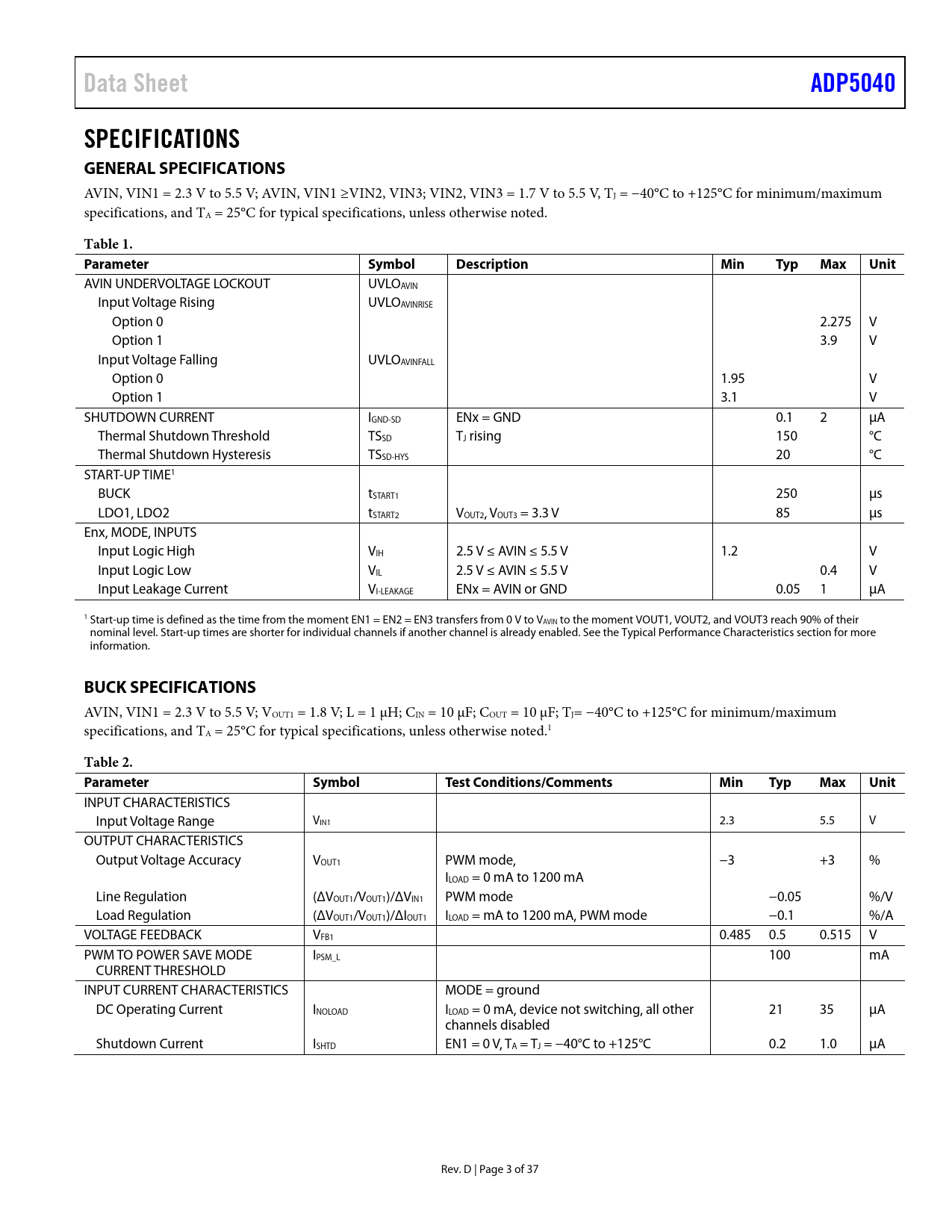 link to page 8 link to page 4 Data SheetADP5040SPECIFICATIONS GENERAL SPECIFICATIONS AVIN, VIN1 = 2.3 V to 5.5 V; AVIN, VIN1 ≥VIN2, VIN3; VIN2, VIN3 = 1.7 V to 5.5 V, TJ = −40°C to +125°C for minimum/maximum specifications, and TA = 25°C for typical specifications, unless otherwise noted. Table 1. Parameter SymbolDescriptionMinTypMaxUnit AVIN UNDERVOLTAGE LOCKOUT UVLOAVIN Input Voltage Rising UVLOAVINRISE Option 0 2.275 V Option 1 3.9 V Input Voltage Falling UVLOAVINFALL Option 0 1.95 V Option 1 3.1 V SHUTDOWN CURRENT IGND-SD ENx = GND 0.1 2 μA Thermal Shutdown Threshold TSSD TJ rising 150 °C Thermal Shutdown Hysteresis TSSD-HYS 20 °C START-UP TIME1 BUCK tSTART1 250 μs LDO1, LDO2 tSTART2 VOUT2, VOUT3 = 3.3 V 85 μs Enx, MODE, INPUTS Input Logic High VIH 2.5 V ≤ AVIN ≤ 5.5 V 1.2 V Input Logic Low VIL 2.5 V ≤ AVIN ≤ 5.5 V 0.4 V Input Leakage Current VI-LEAKAGE ENx = AVIN or GND 0.05 1 μA 1 Start-up time is defined as the time from the moment EN1 = EN2 = EN3 transfers from 0 V to VAVIN to the moment VOUT1, VOUT2, and VOUT3 reach 90% of their nominal level. Start-up times are shorter for individual channels if another channel is already enabled. See the Typical Performance Characteristics section for more information. BUCK SPECIFICATIONS AVIN, VIN1 = 2.3 V to 5.5 V; VOUT1 = 1.8 V; L = 1 μH; CIN = 10 μF; COUT = 10 μF; TJ= −40°C to +125°C for minimum/maximum specifications, and TA = 25°C for typical specifications, unless otherwise noted.1 Table 2. Parameter SymbolTestConditions/CommentsMinTypMaxUnit INPUT CHARACTERISTICS Input Voltage Range VIN1 2.3 5.5 V OUTPUT CHARACTERISTICS Output Voltage Accuracy VOUT1 PWM mode, −3 +3 % ILOAD = 0 mA to 1200 mA Line Regulation (ΔVOUT1/VOUT1)/ΔVIN1 PWM mode −0.05 %/V Load Regulation (ΔVOUT1/VOUT1)/ΔIOUT1 ILOAD = mA to 1200 mA, PWM mode −0.1 %/A VOLTAGE FEEDBACK VFB1 0.485 0.5 0.515 V PWM TO POWER SAVE MODE IPSM_L 100 mA CURRENT THRESHOLD INPUT CURRENT CHARACTERISTICS MODE = ground DC Operating Current INOLOAD ILOAD = 0 mA, device not switching, all other 21 35 μA channels disabled Shutdown Current ISHTD EN1 = 0 V, TA = TJ = −40°C to +125°C 0.2 1.0 μA Rev. D | Page 3 of 37 Document Outline FEATURES GENERAL DESCRIPTION FUNCTIONAL BLOCK DIAGRAM TABLE OF CONTENTS REVISION HISTORY SPECIFICATIONS GENERAL SPECIFICATIONS BUCK SPECIFICATIONS LDO1, LDO2 SPECIFICATIONS INPUT AND OUTPUT CAPACITOR, RECOMMENDED SPECIFICATIONS ABSOLUTE MAXIMUM RATINGS THERMAL RESISTANCE ESD CAUTION PIN CONFIGURATION AND FUNCTION DESCRIPTIONS TYPICAL PERFORMANCE CHARACTERISTICS THEORY OF OPERATION POWER MANAGEMENT UNIT Thermal Protection Undervoltage Lockout Enable/Shutdown Active Pull-Down BUCK SECTION Control Scheme PWM Mode Power Save Mode (PSM) PSM Current Threshold Short-Circuit Protection Soft Start Current Limit 100% Duty Operation LDO SECTION APPLICATIONS INFORMATION BUCK EXTERNAL COMPONENT SELECTION Feedback Resistors Inductor Output Capacitor Input Capacitor LDO EXTERNAL COMPONENT SELECTION Feedback Resistors Output Capacitor Input Bypass Capacitor Input and Output Capacitor Properties POWER DISSIPATION/THERMAL CONSIDERATIONS Buck Regulator Power Dissipation LDO Regulator Power Dissipation Junction Temperature APPLICATION DIAGRAM PCB LAYOUT GUIDELINES SUGGESTED LAYOUT BILL OF MATERIALS FACTORY PROGRAMMABLE OPTIONS OUTLINE DIMENSIONS ORDERING GUIDE