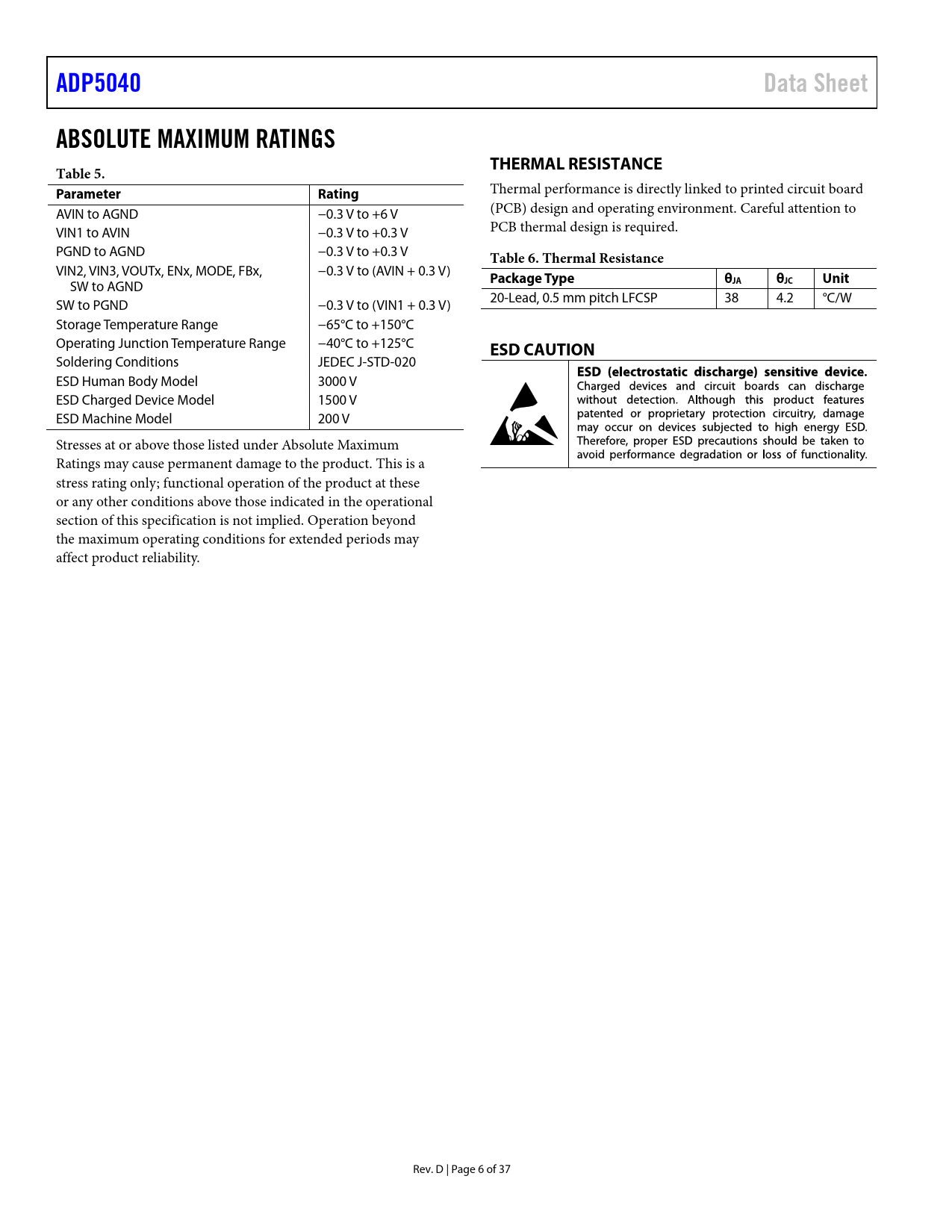 ADP5040Data SheetABSOLUTE MAXIMUM RATINGSTHERMAL RESISTANCETable 5. Parameter Rating Thermal performance is directly linked to printed circuit board AVIN to AGND −0.3 V to +6 V (PCB) design and operating environment. Careful attention to VIN1 to AVIN −0.3 V to +0.3 V PCB thermal design is required. PGND to AGND −0.3 V to +0.3 V Table 6. Thermal Resistance VIN2, VIN3, VOUTx, ENx, MODE, FBx, −0.3 V to (AVIN + 0.3 V) Package Typeθ SW to AGND JAθJC Unit 20-Lead, 0.5 mm pitch LFCSP 38 4.2 °C/W SW to PGND −0.3 V to (VIN1 + 0.3 V) Storage Temperature Range −65°C to +150°C Operating Junction Temperature Range −40°C to +125°C ESD CAUTION Soldering Conditions JEDEC J-STD-020 ESD Human Body Model 3000 V ESD Charged Device Model 1500 V ESD Machine Model 200 V Stresses at or above those listed under Absolute Maximum Ratings may cause permanent damage to the product. This is a stress rating only; functional operation of the product at these or any other conditions above those indicated in the operational section of this specification is not implied. Operation beyond the maximum operating conditions for extended periods may affect product reliability. Rev. D | Page 6 of 37 Document Outline FEATURES GENERAL DESCRIPTION FUNCTIONAL BLOCK DIAGRAM TABLE OF CONTENTS REVISION HISTORY SPECIFICATIONS GENERAL SPECIFICATIONS BUCK SPECIFICATIONS LDO1, LDO2 SPECIFICATIONS INPUT AND OUTPUT CAPACITOR, RECOMMENDED SPECIFICATIONS ABSOLUTE MAXIMUM RATINGS THERMAL RESISTANCE ESD CAUTION PIN CONFIGURATION AND FUNCTION DESCRIPTIONS TYPICAL PERFORMANCE CHARACTERISTICS THEORY OF OPERATION POWER MANAGEMENT UNIT Thermal Protection Undervoltage Lockout Enable/Shutdown Active Pull-Down BUCK SECTION Control Scheme PWM Mode Power Save Mode (PSM) PSM Current Threshold Short-Circuit Protection Soft Start Current Limit 100% Duty Operation LDO SECTION APPLICATIONS INFORMATION BUCK EXTERNAL COMPONENT SELECTION Feedback Resistors Inductor Output Capacitor Input Capacitor LDO EXTERNAL COMPONENT SELECTION Feedback Resistors Output Capacitor Input Bypass Capacitor Input and Output Capacitor Properties POWER DISSIPATION/THERMAL CONSIDERATIONS Buck Regulator Power Dissipation LDO Regulator Power Dissipation Junction Temperature APPLICATION DIAGRAM PCB LAYOUT GUIDELINES SUGGESTED LAYOUT BILL OF MATERIALS FACTORY PROGRAMMABLE OPTIONS OUTLINE DIMENSIONS ORDERING GUIDE