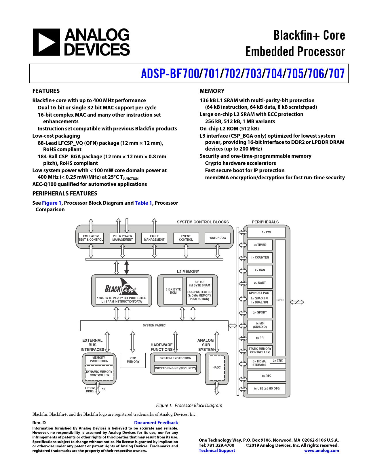 Blackfin+ Core Embedded Processor ADSP-BF700/ 701 /702 /703 /704/ 705/ 706/ 707 FEATURES MEMORY Blackfin+ core with up to 400 MHz performance 136 kB L1 SRAM with multi-parity-bit protection
