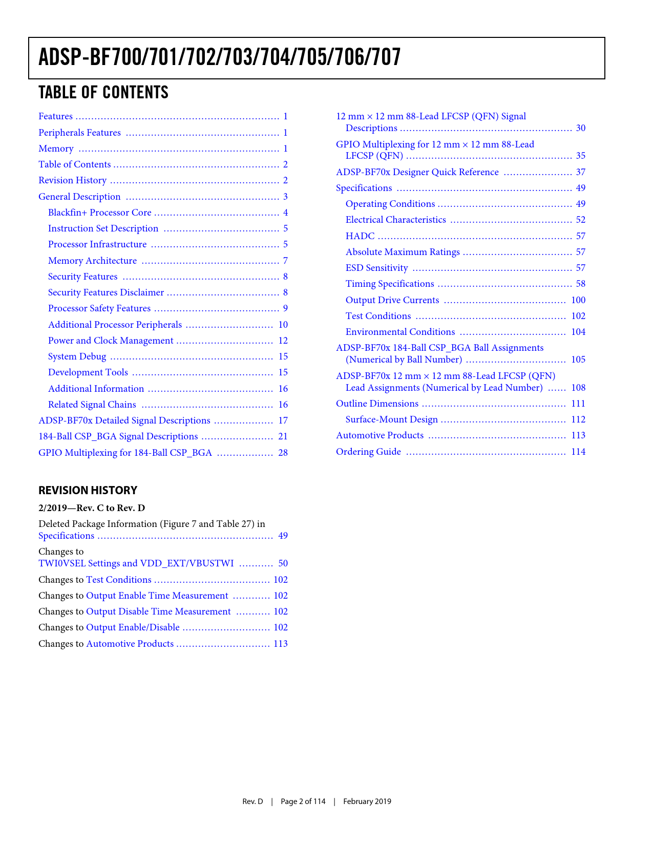 link to page 1 link to page 1 link to page 1 link to page 2 link to page 2 link to page 3 link to page 4 link to page 5 link to page 5 link to page 7 link to page 8 link to page 8 link to page 9 link to page 10 link to page 12 link to page 15 link to page 15 link to page 16 link to page 16 link to page 17 link to page 21 link to page 28 link to page 30 link to page 35 link to page 37 link to page 49 link to page 49 link to page 52 link to page 57 link to page 57 link to page 57 link to page 58 link to page 100 link to page 102 link to page 104 link to page 105 link to page 108 link to page 111 link to page 112 link to page 113 link to page 114 link to page 49 link to page 50 link to page 113 link to page 102 link to page 102 link to page 102 link to page 102 ADSP-BF700/701/702/703/704/705/706/707TABLE OF CONTENTS Features . 1 12 mm × 12 mm 88-Lead LFCSP (QFN) Signal Peripherals Features . 1 Descriptions . 30 Memory . 1 GPIO Multiplexing for 12 mm × 12 mm 88-Lead LFCSP (QFN) . 35 Table of Contents . 2 ADSP-BF70x Designer Quick Reference . 37 Revision History . 2 Specifications . 49 General Description . 3 Operating Conditions . 49 Blackfin+ Processor Core . 4 Electrical Characteristics . 52 Instruction Set Description . 5 HADC . 57 Processor Infrastructure . 5 Absolute Maximum Ratings . 57 Memory Architecture . 7 ESD Sensitivity . 57 Security Features . 8 Timing Specifications . 58 Security Features Disclaimer . 8 Output Drive Currents . 100 Processor Safety Features . 9 Test Conditions . 102 Additional Processor Peripherals . 10 Environmental Conditions . 104 Power and Clock Management . 12 ADSP-BF70x 184-Ball CSP_BGA Ball Assignments System Debug . 15 (Numerical by Ball Number) . 105 Development Tools . 15 ADSP-BF70x 12 mm × 12 mm 88-Lead LFCSP (QFN) Additional Information . 16 Lead Assignments (Numerical by Lead Number) . 108 Related Signal Chains . 16 Outline Dimensions . 111 ADSP-BF70x Detailed Signal Descriptions . 17 Surface-Mount Design . 112 184-Ball CSP_BGA Signal Descriptions . 21 Automotive Products . 113 GPIO Multiplexing for 184-Ball CSP_BGA . 28 Ordering Guide . 114 REVISION HISTORY2/2019—Rev. C to Rev. D Deleted Package Information (Figure 7 and Table 27) in Specifications . 49 Changes to TWI0VSEL Settings and VDD_EXT/VBUSTWI . 50 Changes to Test Conditions . 102 Changes to Output Enable Time Measurement . 102 Changes to Output Disable Time Measurement . 102 Changes to Output Enable/Disable . 102 Changes to Automotive Products . 113 Rev. D | Page 2 of 114 | February 2019 Document Outline Blackfin+ Core Embedded Processor Features Peripherals Features Memory Table of Contents Revision History General Description Blackfin+ Processor Core Instruction Set Description Processor Infrastructure DMA Controllers Event Handling Trigger Routing Unit (TRU) General-Purpose I/O (GPIO) Pin Interrupts Pin Multiplexing Memory Architecture Internal (Core-Accessible) Memory OTP Memory Static Memory Controller (SMC) Dynamic Memory Controller (DMC) I/O Memory Space Booting Security Features Security Features Disclaimer Processor Safety Features Multi-Parity-Bit-Protected L1 Memories ECC-Protected L2 Memories CRC-Protected Memories Memory Protection System Protection Watchpoint Protection Watchdog Bandwidth Monitor Signal Watchdogs Up/Down Count Mismatch Detection Fault Management Additional Processor Peripherals Timers Serial Ports (SPORTs) General-Purpose Counters Parallel Peripheral Interface (PPI) Serial Peripheral Interface (SPI) Ports SPI Host Port (SPIHP) UART Ports 2-Wire Controller Interface (TWI) Mobile Storage Interface (MSI) Controller Area Network (CAN) USB 2.0 On-the-Go Dual-Role Device Controller Housekeeping ADC (HADC) System Crossbars (SCB) Power and Clock Management System Crystal Oscillator and USB Crystal Oscillator Real-Time Clock Clock Generation Clock Out/External Clock Power Management Reset Control Unit Voltage Regulation System Debug System Watchpoint Unit Debug Access Port Development Tools Integrated Development Environments (IDEs) EZ-KIT Lite Evaluation Board EZ-KIT Lite Evaluation Kits ADSP-BF706 EZ-KIT Mini Blackfin Low Power Imaging Platform (BLIP) Software Add-Ins for CrossCore Embedded Studio Algorithmic Modules Designing an Emulator-Compatible DSP Board (Target) Additional Information Related Signal Chains ADSP-BF70x Detailed Signal Descriptions 184-Ball CSP_BGA Signal Descriptions GPIO Multiplexing for 184-Ball CSP_BGA 12 mm × 12 mm 88-Lead LFCSP (QFN) Signal Descriptions GPIO Multiplexing for 12 mm × 12 mm 88-Lead LFCSP (QFN) ADSP-BF70x Designer Quick Reference Specifications Operating Conditions Clock Related Operating Conditions Electrical Characteristics Total Internal Power Dissipation HADC HADC Electrical Characteristics HADC DC Accuracy HADC Timing Specifications Absolute Maximum Ratings ESD Sensitivity Timing Specifications Clock and Reset Timing Power-Up Reset Timing Asynchronous Read SMC Read Cycle Timing With Reference to SYS_CLKOUT Asynchronous Flash Read Asynchronous Page Mode Read Asynchronous Write SMC Write Cycle Timing With Reference to SYS_CLKOUT Asynchronous Flash Write All Accesses DDR2 SDRAM Clock and Control Cycle Timing DDR2 SDRAM Read Cycle Timing DDR2 SDRAM Write Cycle Timing Mobile DDR SDRAM Clock and Control Cycle Timing Mobile DDR SDRAM Read Cycle Timing Mobile DDR SDRAM Write Cycle Timing General-Purpose I/O Port Timing (GPIO) Timer Cycle Timing Up/Down Counter/Rotary Encoder Timing Debug Interface (JTAG Emulation Port) Timing Serial Ports Serial Peripheral Interface (SPI) Port—Master Timing Serial Peripheral Interface (SPI) Port—Slave Timing Serial Peripheral Interface (SPI) Port—SPI_RDY Slave Timing Serial Peripheral Interface (SPI) Port—Open Drain Mode (ODM) Timing Serial Peripheral Interface (SPI) Port—SPI_RDY Timing Enhanced Parallel Peripheral Interface Timing Universal Asynchronous Receiver-Transmitter (UART) Ports—Receive and Transmit Timing Controller Area Network (CAN) Interface Universal Serial Bus (U