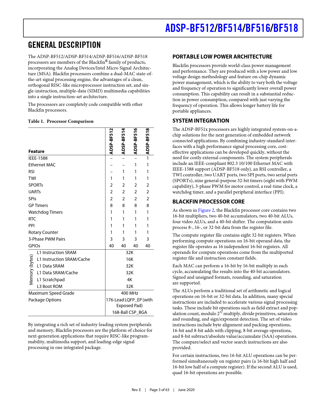link to page 4 ADSP-BF512/BF514/BF516/BF518GENERAL DESCRIPTION The ADSP-BF512/ADSP-BF514/ADSP-BF516/ADSP-BF518 PORTABLE LOW POWER ARCHITECTURE processors are members of the Blackfin® family of products, Blackfin processors provide world-class power management incorporating the Analog Devices/Intel Micro Signal Architec- and performance. They are produced with a low power and low ture (MSA). Blackfin processors combine a dual-MAC state-of- voltage design methodology and feature on-chip dynamic the-art signal processing engine, the advantages of a clean, power management, which is the ability to vary both the voltage orthogonal RISC-like microprocessor instruction set, and sin- and frequency of operation to significantly lower overall power gle-instruction, multiple-data (SIMD) multimedia capabilities consumption. This capability can result in a substantial reduc- into a single instruction-set architecture. tion in power consumption, compared with just varying the The processors are completely code compatible with other frequency of operation. This allows longer battery life for Blackfin processors. portable appliances. Table 1. Processor ComparisonSYSTEM INTEGRATION The ADSP-BF51x processors are highly integrated system-on-a- chip solutions for the next generation of embedded network -BF512-BF514-BF516-BF518 connected applications. By combining industry-standard inter- faces with a high performance signal processing core, cost- FeatureADSPADSPADSPADSP effective applications can be developed quickly, without the IEEE-1588 – – – 1 need for costly external components. The system peripherals include an IEEE-compliant 802.3 10/100 Ethernet MAC with Ethernet MAC – – 1 1 IEEE-1588 support (ADSP-BF518 only), an RSI controller, a RSI – 1 1 1 TWI controller, two UART ports, two SPI ports, two serial ports TWI 1 1 1 1 (SPORTs), nine general-purpose 32-bit timers (eight with PWM SPORTs 2 2 2 2 capability), 3-phase PWM for motor control, a real-time clock, a UARTs 2 2 2 2 watchdog timer, and a parallel peripheral interface (PPI). SPIs 2 2 2 2 BLACKFIN PROCESSOR CORE GP Timers 8 8 8 8 As shown in Figure 2, the Blackfin processor core contains two Watch dog Timers 1 1 1 1 16-bit multipliers, two 40-bit accumulators, two 40-bit ALUs, RTC 1 1 1 1 four video ALUs, and a 40-bit shifter. The computation units PPI 1 1 1 1 process 8-, 16-, or 32-bit data from the register file. Ro tary Counter 1 1 1 1 The compute register file contains eight 32-bit registers. When 3-Ph ase P WM Pairs 3 3 3 3 performing compute operations on 16-bit operand data, the GPIOs 40 40 40 40 register file operates as 16 independent 16-bit registers. All L1 Instruction SRAM 32K operands for compute operations come from the multiported register file and instruction constant fields. L1 Instruction SRAM/Cache 16K L1 Data SRAM 32K Each MAC can perform a 16-bit by 16-bit multiply in each (bytes) y cycle, accumulating the results into the 40-bit accumulators. L1 Data SRAM/Cache 32K mor Signed and unsigned formats, rounding, and saturation e L1 Scratchpad 4K M are supported. L3 Boot ROM 32K The ALUs perform a traditional set of arithmetic and logical Maximum Speed Grade 400 MHz operations on 16-bit or 32-bit data. In addition, many special Package Options 176-Lead LQFP_EP (with instructions are included to accelerate various signal processing Exposed Pad) tasks. These include bit operations such as field extract and pop- 168-Ball CSP_BGA ulation count, modulo 232 multiply, divide primitives, saturation and rounding, and sign/exponent detection. The set of video By integrating a rich set of industry-leading system peripherals instructions include byte alignment and packing operations, and memory, Blackfin processors are the platform of choice for 16-bit and 8-bit adds with clipping, 8-bit average operations, next-generation applications that require RISC-like program- and 8-bit subtract/absolute value/accumulate (SAA) operations. mability, multimedia support, and leading-edge signal The compare/select and vector search instructions are also processing in one integrated package. provided. For certain instructions, two 16-bit ALU operations can be per- formed simultaneously on register pairs (a 16-bit high half and 16-bit low half of a compute register). If the second ALU is used, quad 16-bit operations are possible. Rev. E | Page 3 of 63 | June 2020 Document Outline Blackfin Embedded Processor Features Memory Peripherals Table of Contents Revision History General Description Portable Low Power Architecture System Integration Blackfin Processor Core Memory Architecture Internal (On-Chip) Memory External (Off-Chip) Memory One-Time Programmable Memory I/O Memory Space Booting from ROM Event Handling Core Event Controller (CEC) System Interrupt Controller (SIC) DMA Controllers Processor Peripherals Real-Time Clock Watchdog Timer Timers 3-Phase PWM General-Purpose (GP) Counter Serial Ports Serial Peripheral Interface (SPI) Ports UART Ports 2-Wire Interface (TWI) Removable Storage Interface (RSI) 10/100 Ethernet MAC IEEE 1588 Support Ports General-Purpose I/O (GPIO) Parallel Peripheral Interface (PPI) Code Security with Lockbox Secure Technology Lockbox Secure Technology Disclaimer Dynamic Power Management Full-On Operating Mode—Maximum Performance Active Operating Mode—Moderate Power Savings Sleep Operating Mode—High Dynamic Power Savings Deep Sleep Operating Mode—Maximum Dynamic Power Savings Hibernate State—Maximum Static Power Savings Power Savings Voltage Regulation Interface Clock Signals Booting Modes Instruction Set Description Development Tools Integrated Development Environments (IDEs) EZ-KIT Lite Evaluation Board EZ-KIT Lite Evaluation Kits Software Add-Ins for CrossCore Embedded Studio Board Support Packages for Evaluation Hardware Middleware Packages Algorithmic Modules Designing an Emulator-Compatible DSP Board (Target) Additional Information Related Signal Chains Signal Descriptions Specifications Operating Condit