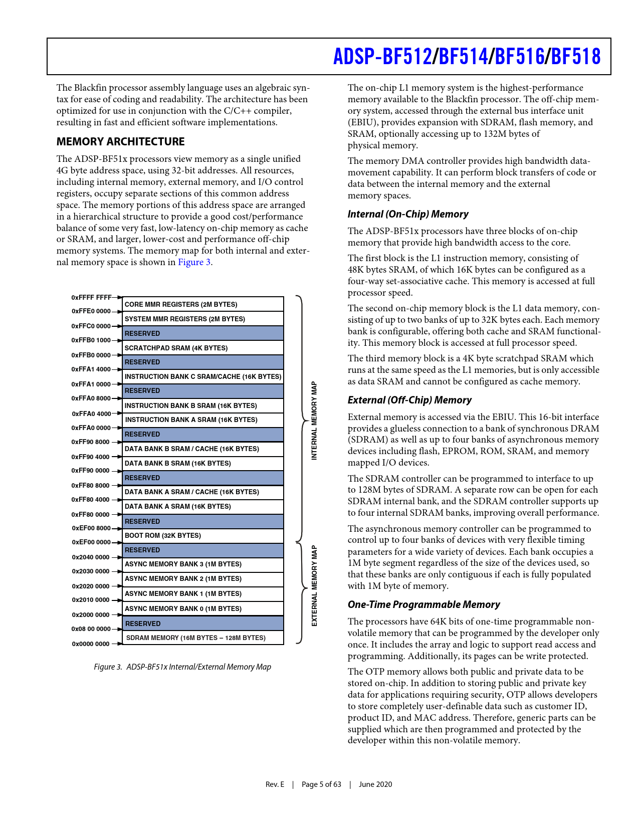 link to page 5 ADSP-BF512/BF514/BF516/BF518 The Blackfin processor assembly language uses an algebraic syn- The on-chip L1 memory system is the highest-performance tax for ease of coding and readability. The architecture has been memory available to the Blackfin processor. The off-chip mem- optimized for use in conjunction with the C/C++ compiler, ory system, accessed through the external bus interface unit resulting in fast and efficient software implementations. (EBIU), provides expansion with SDRAM, flash memory, and SRAM, optionally accessing up to 132M bytes of MEMORY ARCHITECTURE physical memory. The ADSP-BF51x processors view memory as a single unified The memory DMA controller provides high bandwidth data- 4G byte address space, using 32-bit addresses. All resources, movement capability. It can perform block transfers of code or including internal memory, external memory, and I/O control data between the internal memory and the external registers, occupy separate sections of this common address memory spaces. space. The memory portions of this address space are arranged in a hierarchical structure to provide a good cost/performance Internal (On-Chip) Memory balance of some very fast, low-latency on-chip memory as cache The ADSP-BF51x processors have three blocks of on-chip or SRAM, and larger, lower-cost and performance off-chip memory that provide high bandwidth access to the core. memory systems. The memory map for both internal and exter- nal memory space is shown in Figure 3. The first block is the L1 instruction memory, consisting of 48K bytes SRAM, of which 16K bytes can be configured as a four-way set-associative cache. This memory is accessed at full processor speed. 0xFFFF FFFFCORE MMR REGISTERS (2M BYTES)0xFFE0 0000 The second on-chip memory block is the L1 data memory, con- SYSTEM MMR REGISTERS (2M BYTES) sisting of up to two banks of up to 32K bytes each. Each memory 0xFFC0 0000RESERVED bank is configurable, offering both cache and SRAM functional- 0xFFB0 1000 ity. This memory block is accessed at full processor speed. SCRATCHPAD SRAM (4K BYTES)0xFFB0 0000 The third memory block is a 4K byte scratchpad SRAM which RESERVED0xFFA1 4000 runs at the same speed as the L1 memories, but is only accessible INSTRUCTION BANK C SRAM/CACHE (16K BYTES)0xFFA1 0000P as data SRAM and cannot be configured as cache memory. ARESERVEDM0xFFA0 8000YExternal (Off-Chip) MemoryINSTRUCTION BANK B SRAM (16K BYTES)R0xFFA0 4000MO EINSTRUCTION BANK A SRAM (16K BYTES) External memory is accessed via the EBIU. This 16-bit interface M0xFFA0 0000L provides a glueless connection to a bank of synchronous DRAM RESERVEDA N0xFF90 8000 (SDRAM) as well as up to four banks of asynchronous memory DATA BANK B SRAM / CACHE (16K BYTES)ER T devices including flash, EPROM, ROM, SRAM, and memory 0xFF90 4000INDATA BANK B SRAM (16K BYTES) mapped I/O devices. 0xFF90 0000RESERVED The SDRAM controller can be programmed to interface to up 0xFF80 8000DATA BANK A SRAM / CACHE (16K BYTES) to 128M bytes of SDRAM. A separate row can be open for each 0xFF80 4000 SDRAM internal bank, and the SDRAM controller supports up DATA BANK A SRAM (16K BYTES)0xFF80 0000 to four internal SDRAM banks, improving overall performance. RESERVED0xEF00 8000 The asynchronous memory controller can be programmed to BOOT ROM (32K BYTES)0xEF00 0000 control up to four banks of devices with very flexible timing PRESERVEDA parameters for a wide variety of devices. Each bank occupies a 0x2040 0000MASYNC MEMORY BANK 3 (1M BYTES)Y 1M byte segment regardless of the size of the devices used, so R0x2030 0000O that these banks are only contiguous if each is fully populated ASYNC MEMORY BANK 2 (1M BYTES)M E0x2020 0000M with 1M byte of memory. ASYNC MEMORY BANK 1 (1M BYTES)L0x2010 0000NA ROne-Time Programmable MemoryASYNC MEMORY BANK 0 (1M BYTES)E0x2000 0000T XRESERVEDE The processors have 64K bits of one-time programmable non- 0x08 00 0000 volatile memory that can be programmed by the developer only SDRAM MEMORY (16M BYTES - 128M BYTES)0x0000 0000 once. It includes the array and logic to support read access and programming. Additionally, its pages can be write protected. Figure 3. ADSP-BF51x Internal/External Memory Map The OTP memory allows both public and private data to be stored on-chip. In addition to storing public and private key data for applications requiring security, OTP allows developers to store completely user-definable data such as customer ID, product ID, and MAC address. Therefore, generic parts can be supplied which are then programmed and protected by the developer within this non-volatile memory. Rev. E | Page 5 of 63 | June 2020 Document Outline Blackfin Embedded Processor Features Memory Peripherals Table of Contents Revision History General Description Portable Low Power Architecture System Integration Blackfin Processor Core Memory Architecture Internal (On-Chip) Memory External (Off-Chip) Memory One-Time Programmable Memory I/O Memory Space Booting from ROM Event Handling Core Event Controller (CEC) System Interrupt Controller (SIC) DMA Controllers Processor Peripherals Real-Time Clock Watchdog Timer Timers 3-Phase PWM General-Purpose (GP) Counter Serial Ports Serial Peripheral Interface (SPI) Ports UART Ports 2-Wire Interface (TWI) Removable Storage Interface (RSI) 10/100 Ethernet MAC IEEE 1588 Support Ports General-Purpose I/O (GPIO) Parallel Peripheral Interface (PPI) Code Security with Lockbox Secure Technology Lockbox Secure Technology Disclaimer Dynamic Power Management Full-On Operating Mode—Maximum Performance Active Operating Mode—Moderate Power Savings Sleep Operating Mode—High Dynamic Power Savings Deep Sleep Operating Mode—Maximum Dynamic Power Savings Hibernate State—Maximum Static Power Savings Power Savings Voltage Regulation Interface Clock Signals Booting Modes Instruction Set Description Development Tools Integrated Development Environments (IDEs) EZ-KIT Lite Evaluation Board EZ-KIT Lite Evaluation Kits Software