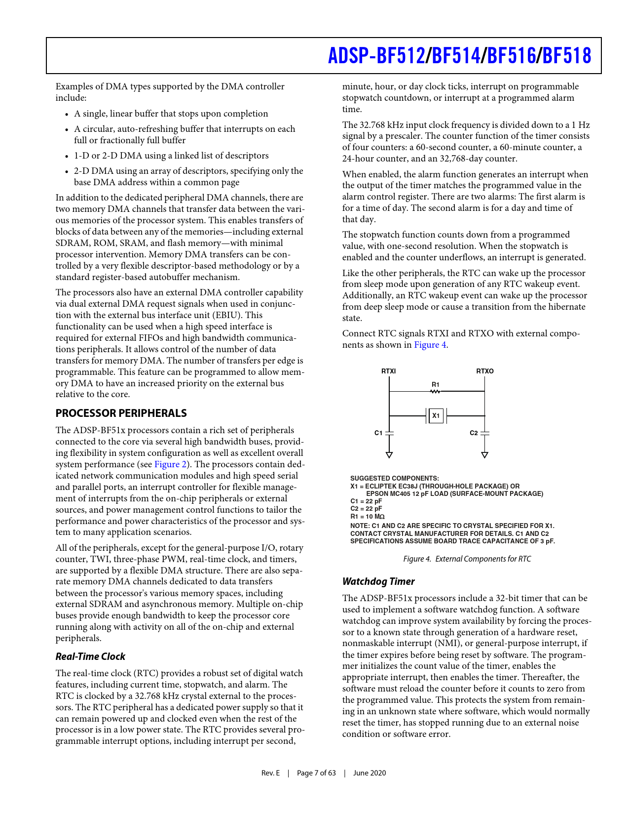 link to page 4 link to page 7 ADSP-BF512/BF514/BF516/BF518 Examples of DMA types supported by the DMA controller minute, hour, or day clock ticks, interrupt on programmable include: stopwatch countdown, or interrupt at a programmed alarm • A single, linear buffer that stops upon completion time. • A circular, auto-refreshing buffer that interrupts on each The 32.768 kHz input clock frequency is divided down to a 1 Hz full or fractionally full buffer signal by a prescaler. The counter function of the timer consists of four counters: a 60-second counter, a 60-minute counter, a • 1-D or 2-D DMA using a linked list of descriptors 24-hour counter, and an 32,768-day counter. • 2-D DMA using an array o f descriptors, specifying only the When enabled, the alarm function generates an interrupt when base DMA address within a common page the output of the timer matches the programmed value in the In addition to the dedicated peripheral DMA channels, there are alarm control register. There are two alarms: The first alarm is two memory DMA channels that transfer data between the vari- for a time of day. The second alarm is for a day and time of ous memories of the processor system. This enables transfers of that day. blocks of data between any of the memories—including external The stopwatch function counts down from a programmed SDRAM, ROM, SRAM, and flash memory—with minimal value, with one-second resolution. When the stopwatch is processor intervention. Memory DMA transfers can be con- enabled and the counter underflows, an interrupt is generated. trolled by a very flexible descriptor-based methodology or by a standard register-based autobuffer mechanism. Like the other peripherals, the RTC can wake up the processor from sleep mode upon generation of any RTC wakeup event. The processors also have an external DMA controller capability Additionally, an RTC wakeup event can wake up the processor via dual external DMA request signals when used in conjunc- from deep sleep mode or cause a transition from the hibernate tion with the external bus interface unit (EBIU). This state. functionality can be used when a high speed interface is required for external FIFOs and high bandwidth communica- Connect RTC signals RTXI and RTXO with external compo- tions peripherals. It allows control of the number of data nents as shown in Figure 4. transfers for memory DMA. The number of transfers per edge is programmable. This feature can be programmed to allow mem- RTXIRTXO ory DMA to have an increased priority on the external bus R1 relative to the core. PROCESSOR PERIPHERALSX1 The ADSP-BF51x processors contain a rich set of peripherals C1C2 connected to the core via several high bandwidth buses, provid- ing flexibility in system configuration as well as excellent overall system performance (see Figure 2). The processors contain ded- icated network communication modules and high speed serial SUGGESTED COMPONENTS: and parallel ports, an interrupt controller for flexible manage- X1 = ECLIPTEK EC38J (THROUGH-HOLE PACKAGE) OREPSON MC405 12 pF LOAD (SURFACE-MOUNT PACKAGE) ment of interrupts from the on-chip peripherals or external C1 = 22 pF sources, and power management control functions to tailor the C2 = 22 pF performance and power characteristics of the processor and sys- R1 = 10 M : NOTE: C1 AND C2 ARE SPECIFIC TO CRYSTAL SPECIFIED FOR X1. tem to many application scenarios. CONTACT CRYSTAL MANUFACTURER FOR DETAILS. C1 AND C2 SPECIFICATIONS ASSUME BOARD TRACE CAPACITANCE OF 3 pF. All of the peripherals, except for the general-purpose I/O, rotary counter, TWI, three-phase PWM, real-time clock, and timers, Figure 4. External Components for RTC are supported by a flexible DMA structure. There are also sepa- rate memory DMA channels dedicated to data transfers Watchdog Timer between the processor's various memory spaces, including The ADSP-BF51x processors include a 32-bit timer that can be external SDRAM and asynchronous memory. Multiple on-chip used to implement a software watchdog function. A software buses provide enough bandwidth to keep the processor core watchdog can improve system availability by forcing the proces- running along with activity on all of the on-chip and external sor to a known state through generation of a hardware reset, peripherals. nonmaskable interrupt (NMI), or general-purpose interrupt, if Real-Time Clock the timer expires before being reset by software. The program- mer initializes the count value of the timer, enables the The real-time clock (RTC) provides a robust set of digital watch appropriate interrupt, then enables the timer. Thereafter, the features, including current time, stopwatch, and alarm. The software must reload the counter before it counts to zero from RTC is clocked by a 32.768 kHz crystal external to the proces- the programmed value. This protects the system from remain- sors. The RTC peripheral has a dedicated power supply so that it ing in an unknown state where software, which would normally can remain powered up and clocked even when the rest of the reset the timer, has stopped running due to an external noise processor is in a low power state. The RTC provides several pro- condition or software error. grammable interrupt options, including interrupt per second, Rev. E | Page 7 of 63 | June 2020 Document Outline Blackfin Embedded Processor Features Memory Peripherals Table of Contents Revision History General Description Portable Low Power Architecture System Integration Blackfin Processor Core Memory Architecture Internal (On-Chip) Memory External (Off-Chip) Memory One-Time Programmable Memory I/O Memory Space Booting from ROM Event Handling Core Event Controller (CEC) System Interrupt Controller (SIC) DMA Controllers Processor Peripherals Real-Time Clock Watchdog Timer Timers 3-Phase PWM General-Purpose (GP) Counter Serial Ports Serial Peripheral Interface (SPI) Ports UART Ports 2-Wire Interface (TWI) Removable Storage Interface (RSI) 10/100 Ethernet MAC I