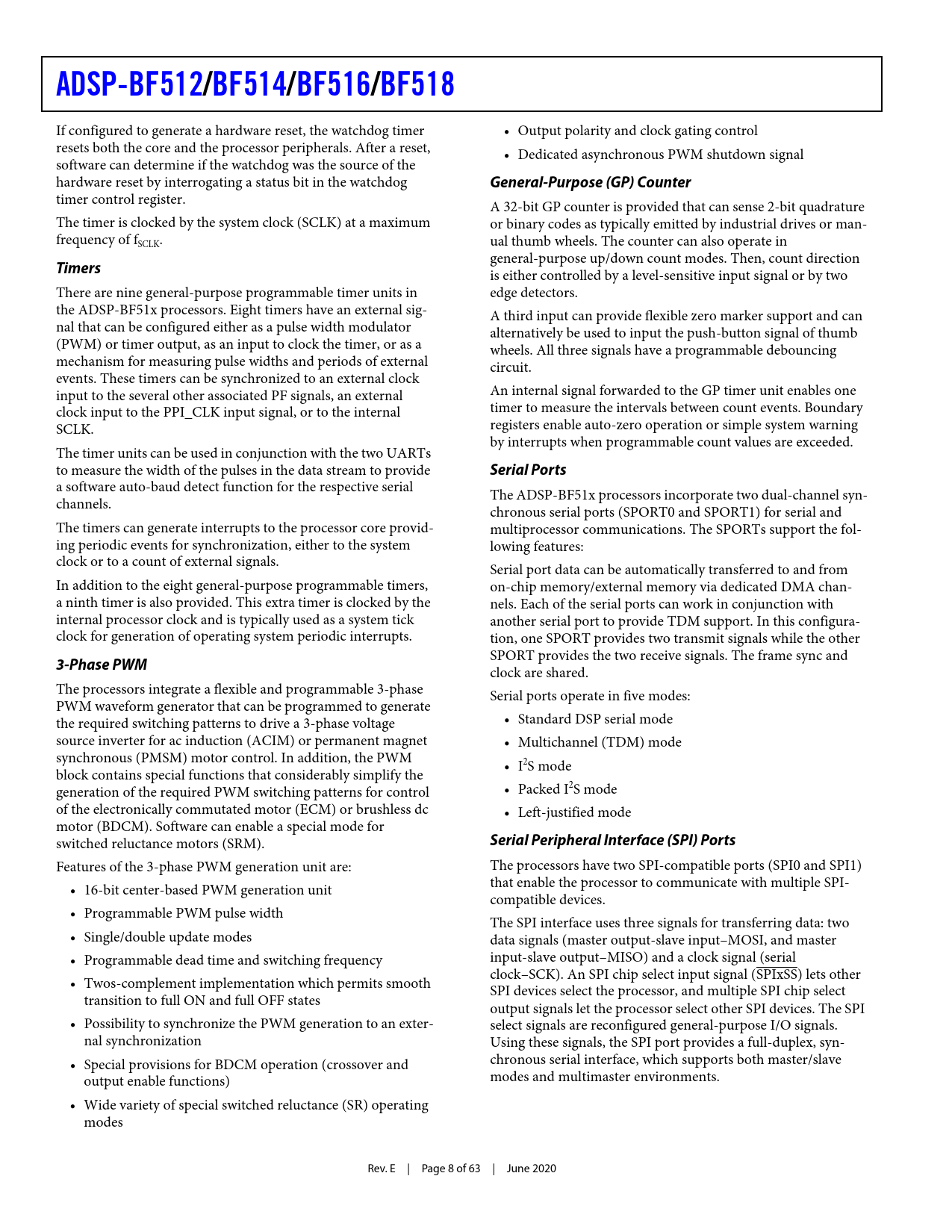 ADSP-BF512/BF514/BF516/BF518 If configured to generate a hardware reset, the watchdog timer • Output polarity and clock gating control resets both the core and the processor peripherals. After a reset, • Dedicated asynchronous PWM shutdown signal software can determine if the watchdog was the source of the hardware reset by interrogating a status bit in the watchdog General-Purpose (GP) Counter timer control register. A 32-bit GP counter is provided that can sense 2-bit quadrature The timer is clocked by the system clock (SCLK) at a maximum or binary codes as typically emitted by industrial drives or man- frequency of fSCLK. ual thumb wheels. The counter can also operate in general-purpose up/down count modes. Then, count direction Timers is either controlled by a level-sensitive input signal or by two There are nine general-purpose programmable timer units in edge detectors. the ADSP-BF51x processors. Eight timers have an external sig- A third input can provide flexible zero marker support and can nal that can be configured either as a pulse width modulator alternatively be used to input the push-button signal of thumb (PWM) or timer output, as an input to clock the timer, or as a wheels. All three signals have a programmable debouncing mechanism for measuring pulse widths and periods of external circuit. events. These timers can be synchronized to an external clock input to the several other associated PF signals, an external An internal signal forwarded to the GP timer unit enables one clock input to the PPI_CLK input signal, or to the internal timer to measure the intervals between count events. Boundary SCLK. registers enable auto-zero operation or simple system warning by interrupts when programmable count values are exceeded. The timer units can be used in conjunction with the two UARTs to measure the width of the pulses in the data stream to provide Serial Ports a software auto-baud detect function for the respective serial The ADSP-BF51x processors incorporate two dual-channel syn- channels. chronous serial ports (SPORT0 and SPORT1) for serial and The timers can generate interrupts to the processor core provid- multiprocessor communications. The SPORTs support the fol- ing periodic events for synchronization, either to the system lowing features: clock or to a count of external signals. Serial port data can be automatically transferred to and from In addition to the eight general-purpose programmable timers, on-chip memory/external memory via dedicated DMA chan- a ninth timer is also provided. This extra timer is clocked by the nels. Each of the serial ports can work in conjunction with internal processor clock and is typically used as a system tick another serial port to provide TDM support. In this configura- clock for generation of operating system periodic interrupts. tion, one SPORT provides two transmit signals while the other SPORT provides the two receive signals. The frame sync and 3-Phase PWM clock are shared. The processors integrate a flexible and programmable 3-phase Serial ports operate in five modes: PWM waveform generator that can be programmed to generate the required switching patterns to drive a 3-phase voltage • Standard DSP serial mode source inverter for ac induction (ACIM) or permanent magnet • Multichanne l (TDM) mode synchronous (PMSM) motor control. In addition, the PWM • I2S mode block contains special functions that considerably simplify the generation of the required PWM switching patterns for control • Packed I2S mode of the electronically commutated motor (ECM) or brushless dc • Left-justified mode motor (BDCM). Software can enable a special mode for switched reluctance motors (SRM). Serial Peripheral Interface (SPI) Ports Features of the 3-phase PWM generation unit are: The processors have two SPI-compatible ports (SPI0 and SPI1) that enable the processor to communicate with multiple SPI- • 16-bit center-based PWM generation unit compatible devices. • Programmable PWM pulse width The SPI interface uses three signals for transferring data: two • Single/double update modes data signals (master output-slave input–MOSI, and master • Programmable dead time and switching frequency input-slave output–MISO) and a clock signal (serial clock–SCK). An SPI chip select input signal (SPIxSS) lets other • Twos-complement implementation which permits smooth SPI devices select the processor, and multiple SPI chip select transition to full ON and full OFF states output signals let the processor select other SPI devices. The SPI • Possibility to synchronize the PWM generation to an exter- select signals are reconfigured general-purpose I/O signals. nal synchronization Using these signals, the SPI port provides a full-duplex, syn- • Special provisions for BDCM operation (crossover and chronous serial interface, which supports both master/slave output enable functions) modes and multimaster environments. • Wide variety of special switched reluctance (SR) operating modes Rev. E | Page 8 of 63 | June 2020 Document Outline Blackfin Embedded Processor Features Memory Peripherals Table of Contents Revision History General Description Portable Low Power Architecture System Integration Blackfin Processor Core Memory Architecture Internal (On-Chip) Memory External (Off-Chip) Memory One-Time Programmable Memory I/O Memory Space Booting from ROM Event Handling Core Event Controller (CEC) System Interrupt Controller (SIC) DMA Controllers Processor Peripherals Real-Time Clock Watchdog Timer Timers 3-Phase PWM General-Purpose (GP) Counter Serial Ports Serial Peripheral Interface (SPI) Ports UART Ports 2-Wire Interface (TWI) Removable Storage Interface (RSI) 10/100 Ethernet MAC IEEE 1588 Support Ports General-Purpose I/O (GPIO) Parallel Peripheral Interface (PPI) Code Security with Lockbox Secure Technology Lockbox Secure Technology Disclaimer Dynamic Power Management Full-On Operating Mode—Maximum Performance Active Operating Mode—Moderate P