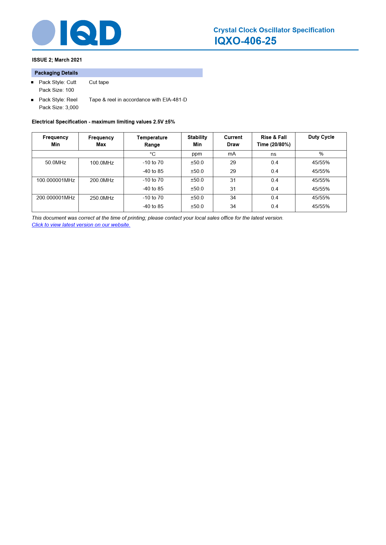 Crystal Clock Oscillator SpecificationIQXO-406-25ISSUE 2; March 2021Packaging Details Pack Style: Cutt Cut tape Pack Size: 100 Pack Style: Reel Tape & reel in accordance with EIA-481-D Pack Size: 3,000 Electrical Specification - maximum limiting values 2.5V ±5%FrequencyFrequencyTemperatureStabilityCurrentRise & FallDuty CycleMinMaxRangeMinDrawTime (20/80%) °C ppm mA ns % 50.0MHz 100.0MHz -10 to 70 ±50.0 29 0.4 45/55% -40 to 85 ±50.0 29 0.4 45/55% 100.000001MHz 200.0MHz -10 to 70 ±50.0 31 0.4 45/55% -40 to 85 ±50.0 31 0.4 45/55% 200.000001MHz 250.0MHz -10 to 70 ±50.0 34 0.4 45/55% -40 to 85 ±50.0 34 0.4 45/55% This document was correct at the time of printing; please contact your local sales office for the latest version. Click to view latest version on our website.