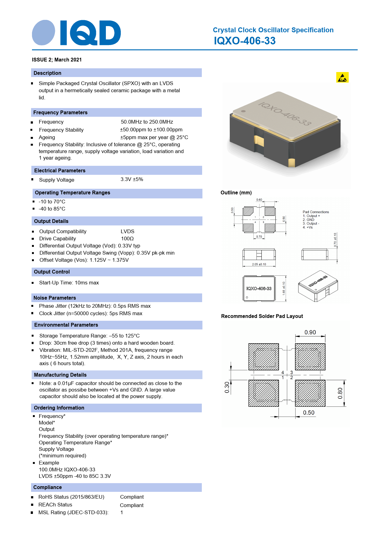 Crystal Clock Oscillator SpecificationIQXO-406-33ISSUE 2; March 2021Description Simple Packaged Crystal Oscillator (SPXO) with an LVDS output in a hermetically sealed ceramic package with a metal lid. Frequency Parameters Frequency 50.0MHz to 250.0MHz Frequency Stability ±50.00ppm to ±100.00ppm Ageing ±5ppm max per year @ 25°C Frequency Stability: Inclusive of tolerance @ 25°C, operating temperature range, supply voltage variation, load variation and 1 year ageing. Electrical Parameters Supply Voltage 3.3V ±5% Operating Temperature RangesOutline (mm) -10 to 70°C -40 to 85°C Output Details Output Compatibility LVDS Drive Capability 100Ω Differential Output Voltage (Vod): 0.33V typ Differential Output Voltage Swing (Vopp): 0.35V pk-pk min Offset Voltage (Vos): 1.125V ~ 1.375V Output Control Start-Up Time: 10ms max Noise Parameters Phase Jitter (12kHz to 20MHz): 0.5ps RMS max Clock Jitter (n=50000 cycles): 5ps RMS max Recommended Solder Pad LayoutEnvironmental Parameters Storage Temperature Range: –55 to 125°C Drop: 30cm free drop (3 times) onto a hard wooden board. Vibration: MIL-STD-202F, Method 201A, frequency range 10Hz~55Hz, 1.52mm amplitude, X, Y, Z axis, 2 hours in each axis ( 6 hours total). Manufacturing Details Note: a 0.01μF capacitor should be connected as close to the oscillator as possibe between +Vs and GND. A large value capacitor should also be located at the power supply. Ordering Information Frequency* Model* Output Frequency Stability (over operating temperature range)* Operating Temperature Range* Supply Voltage (*minimum required) Example 100.0MHz IQXO-406-33 LVDS ±50ppm -40 to 85C 3.3V Compliance RoHS Status (2015/863/EU) Compliant REACh Status Compliant MSL Rating (JDEC-STD-033): 1
