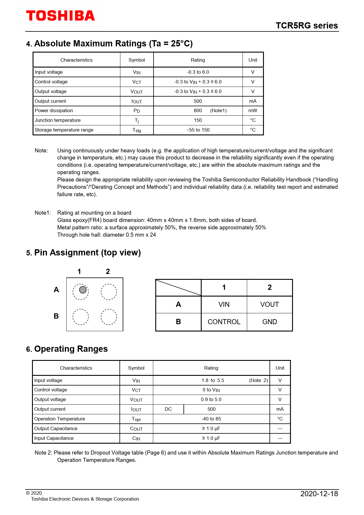 TCR5RG series. 4. Absolute Maximum Ratings (Ta = 25°C). 5. Pin Assignment (top view). 6. Operating Ranges