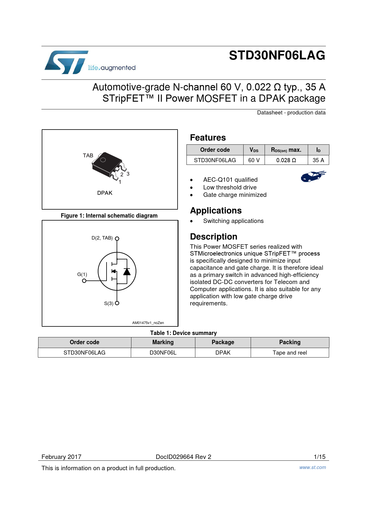 STD30NF06LAG Automotive-grade N-channel 60 V, 0.022 Ω typ., 35 A STripFET™ II Power MOSFET in a DPAK package Datasheet - production data FeaturesOrder codeVDSRDS(on) max.ID STD30NF06LAG 60 V 0.028 Ω 35 A AEC-Q101 qualified Low threshold drive Gate charge minimized ApplicationsFigure 1: Internal schematic diagram Switching applications D(2, TAB) Description This Power MOSFET series realized with STMicroelectronics unique STripFET™ process is specifically designed to minimize input capacitance and gate charge. It is therefore ideal G(1) as a primary switch in advanced high-efficiency isolated DC-DC converters for Telecom and Computer applications. It is also suitable for any application with low gate charge drive S(3) requirements. AM01475v1_noZen Table 1: Device summaryOrder codeMarkingPackagePacking STD30NF06LAG D30NF06L DPAK Tape and reel February 2017 DocID029664 Rev 2 1/15 This is information on a product in full production. www.st.com
