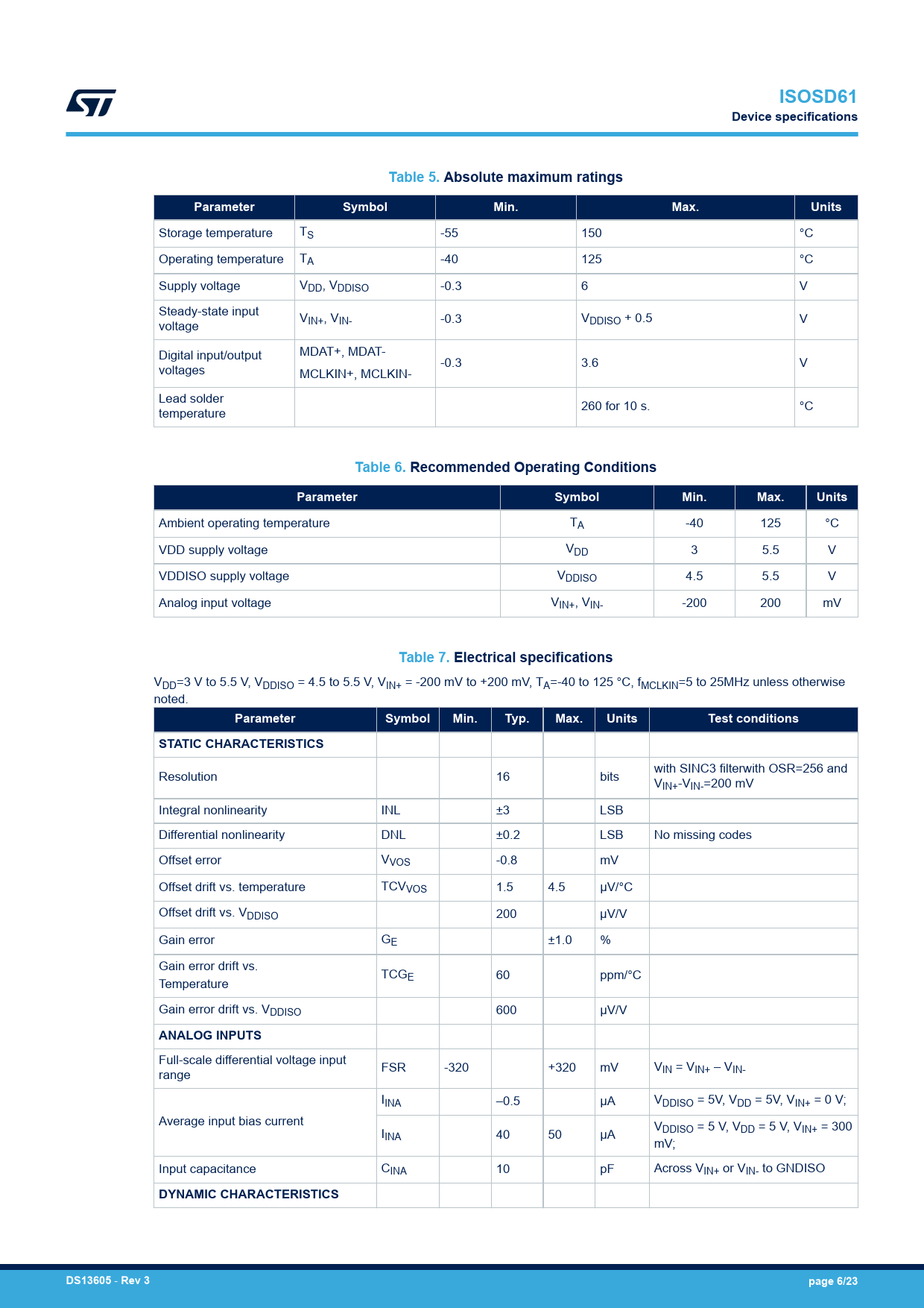 ISOSD61Device specificationsTable 5. Absolute maximum ratingsParameterSymbolMin.Max.Units Storage temperature TS -55 150 °C Operating temperature TA -40 125 °C Supply voltage VDD, VDDISO -0.3 6 V Steady-state input V voltage IN+, VIN- -0.3 VDDISO + 0.5 V Digital input/output MDAT+, MDAT- -0.3 3.6 V voltages MCLKIN+, MCLKIN- Lead solder 260 for 10 s. °C temperature Table 6. Recommended Operating ConditionsParameterSymbolMin.Max.Units Ambient operating temperature TA -40 125 °C VDD supply voltage VDD 3 5.5 V VDDISO supply voltage VDDISO 4.5 5.5 V Analog input voltage VIN+, VIN- -200 200 mV Table 7. Electrical specifications VDD=3 V to 5.5 V, VDDISO = 4.5 to 5.5 V, VIN+ = -200 mV to +200 mV, TA=-40 to 125 °C, fMCLKIN=5 to 25MHz unless otherwise noted. ParameterSymbolMin.Typ.Max.UnitsTest conditionsSTATIC CHARACTERISTICS with SINC3 filterwith OSR=256 and Resolution 16 bits VIN+-VIN-=200 mV Integral nonlinearity INL ±3 LSB Differential nonlinearity DNL ±0.2 LSB No missing codes Offset error VVOS -0.8 mV Offset drift vs. temperature TCVVOS 1.5 4.5 µV/°C Offset drift vs. VDDISO 200 µV/V Gain error GE ±1.0 % Gain error drift vs. TCG Temperature E 60 ppm/°C Gain error drift vs. VDDISO 600 µV/V ANALOG INPUTS Full-scale differential voltage input FSR -320 +320 mV V range IN = VIN+ – VIN- IINA –0.5 µA VDDISO = 5V, VDD = 5V, VIN+ = 0 V; Average input bias current V I DDISO = 5 V, VDD = 5 V, VIN+ = 300 INA 40 50 µA mV; Input capacitance CINA 10 pF Across VIN+ or VIN- to GNDISO DYNAMIC CHARACTERISTICSDS13605 - Rev 3page 6/23 Document Outline Cover image Product status link / summary Features Application Description 1 Device overview 2 Pin description 3 Device specifications 4 Terminology 5 Theory of operation 6 Package description 7 Ordering information Revision history Contents List of tables List of figures