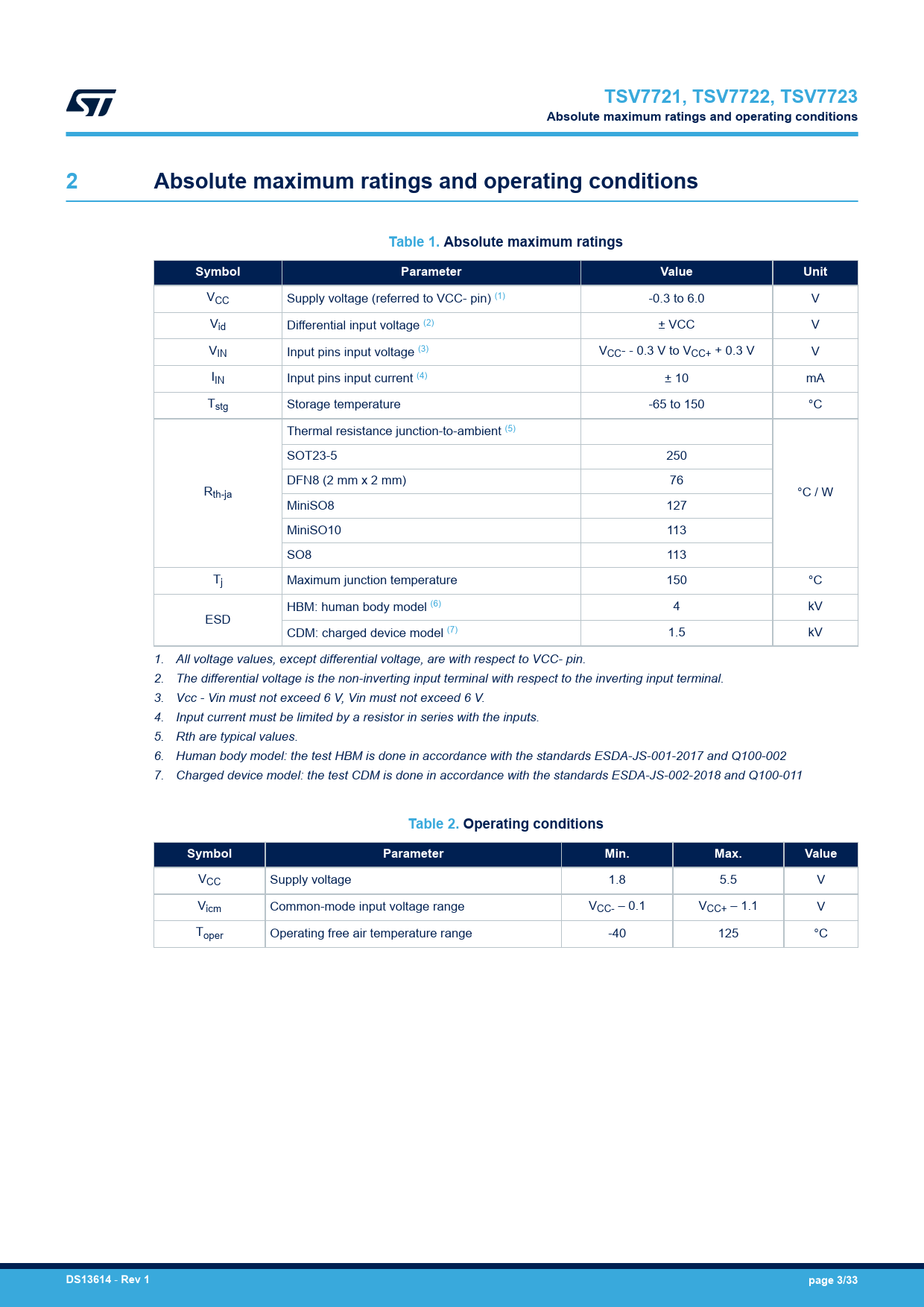 TSV7721, TSV7722, TSV7723. Absolute maximum ratings and operating conditions. Table 1. Absolute maximum ratings. Symbol