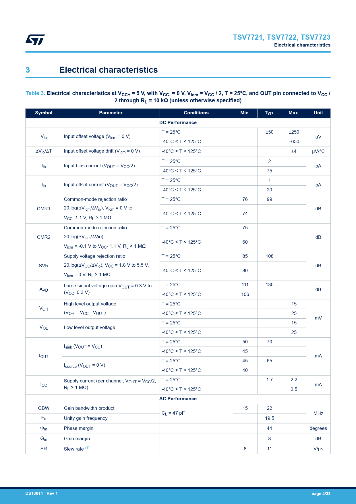 TSV7721, TSV7722, TSV7723 Electrical characteristics 3 Electrical characteristics Table 3. Electrical characteristics at VCC+ = 5 V, with VCC- = 0 V, Vicm = VCC / 2, T = 25°C, and OUT pin connected to VCC / 2 through RL = 10 kΩ (unless otherwise specified) Symbol Parameter Conditions Min. Typ. Max. Unit DC Performance