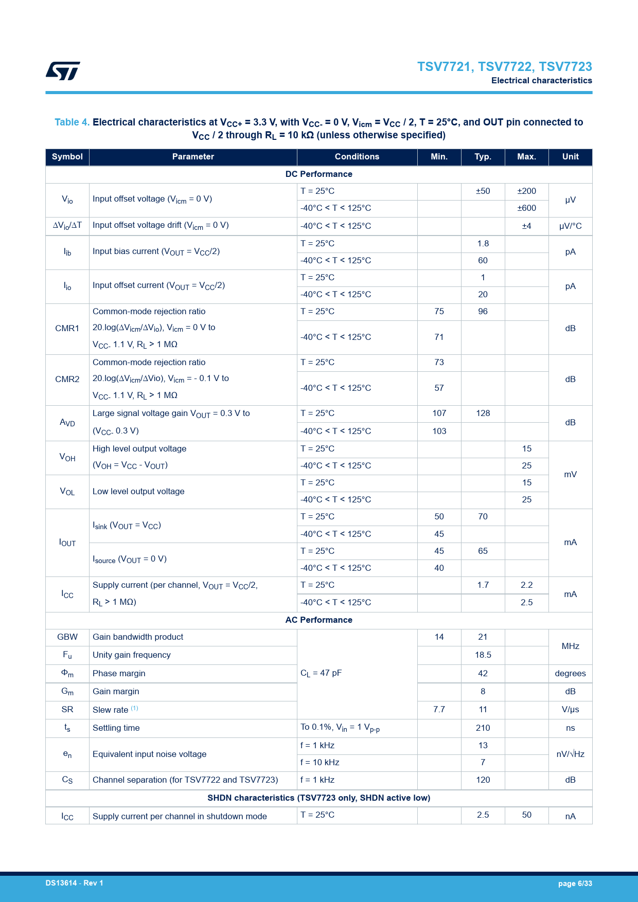 TSV7721, TSV7722, TSV7723 Electrical characteristics Table 4. Electrical characteristics at VCC+ = 3.3 V, with VCC- = 0 V, Vicm = VCC / 2, T = 25°C, and OUT pin connected to VCC / 2 through RL = 10 kΩ (unless otherwise specified) Symbol Parameter Conditions Min. Typ. Max. Unit DC Performance