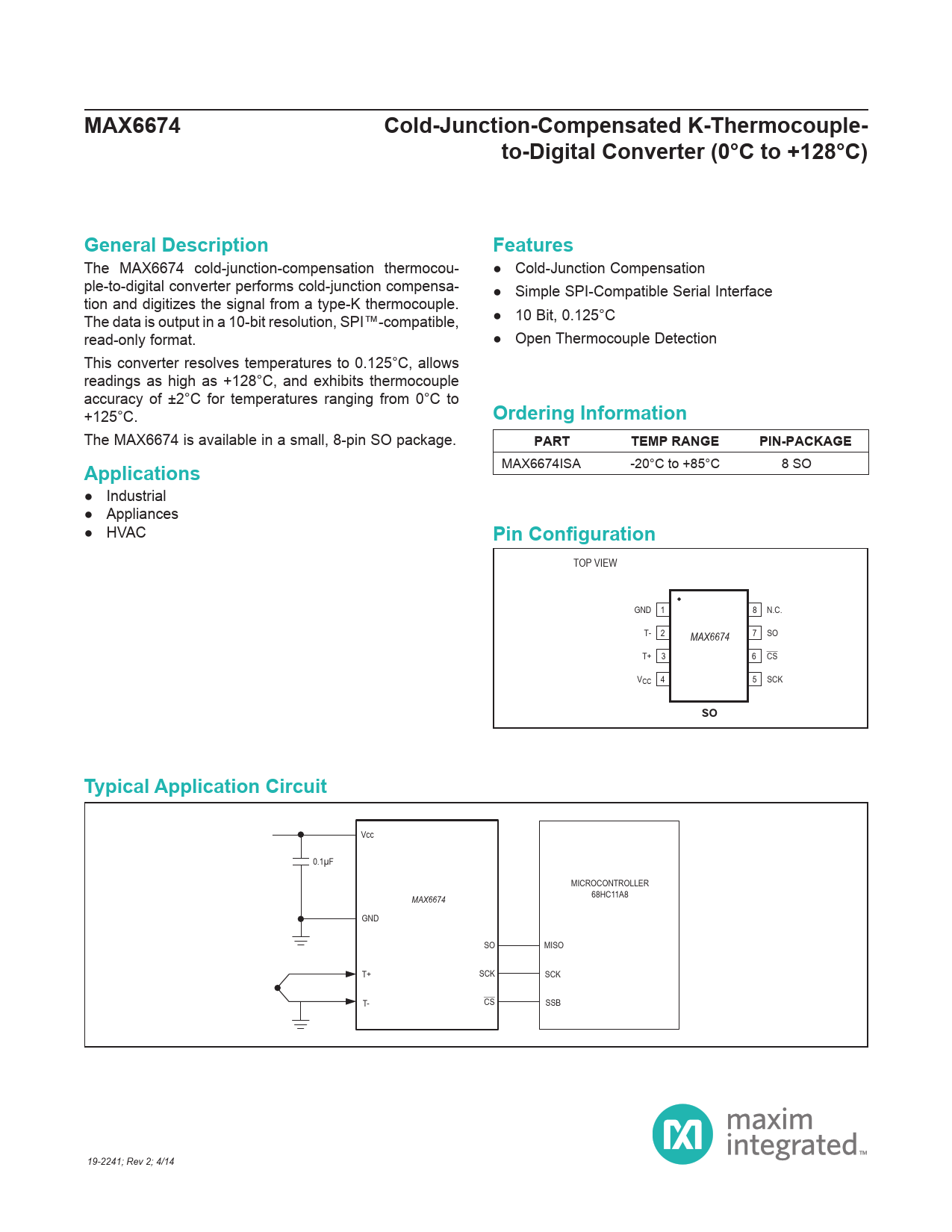 MAX6674. Cold-Junction-Compensated K-Thermocouple-. to-Digital Converter (0°C to +128°C). General Description. Features