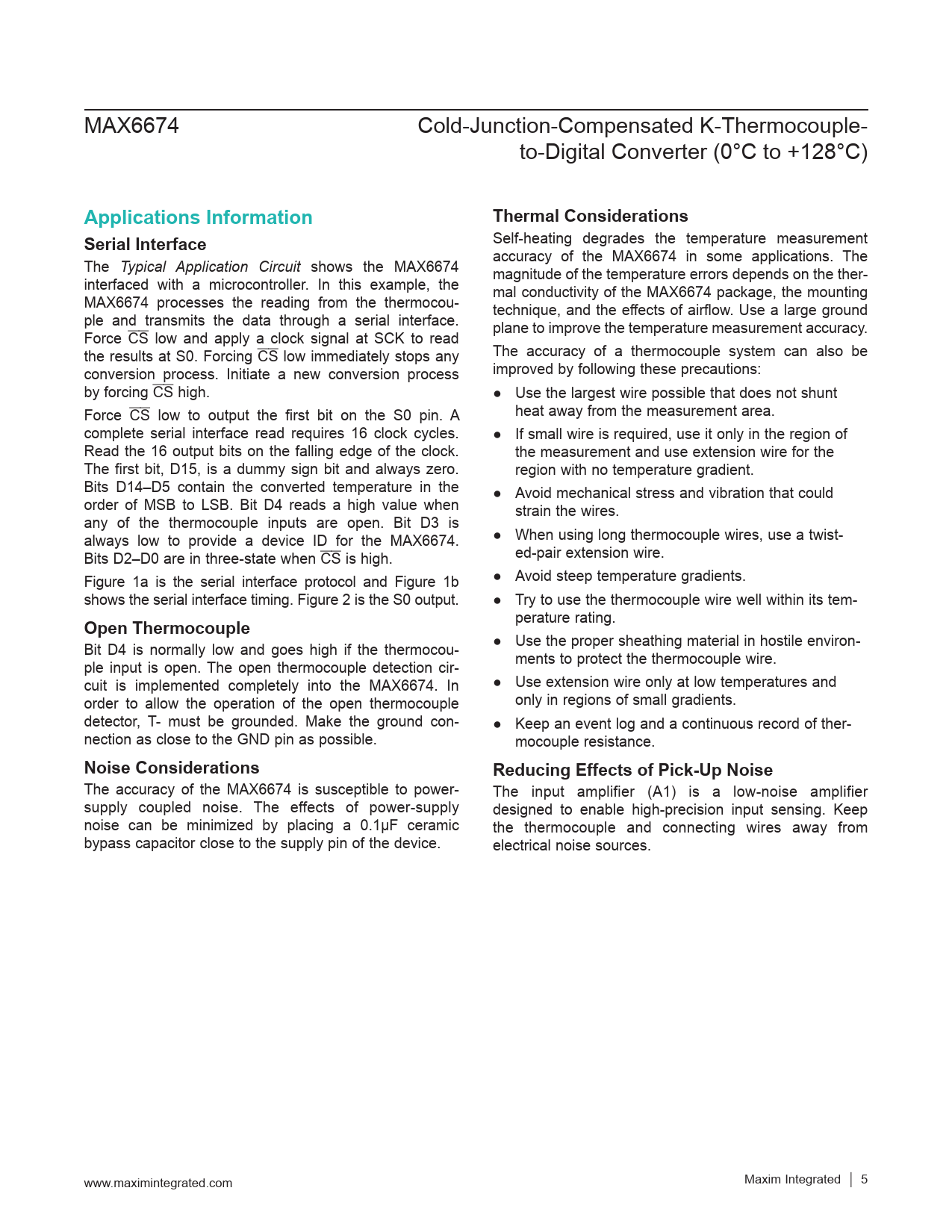 MAX6674 Cold-Junction-Compensated K-Thermocouple- to-Digital Converter (0°C to +128°C) Applications InformationThermal ConsiderationsSerial Interface Self-heating degrades the temperature measurement accuracy of the MAX6674 in some applications. The The Typical Application Circuit shows the MAX6674 magnitude of the temperature errors depends on the ther- interfaced with a microcontroller. In this example, the mal conductivity of the MAX6674 package, the mounting MAX6674 processes the reading from the thermocou- technique, and the effects of airflow. Use a large ground ple and transmits the data through a serial interface. plane to improve the temperature measurement accuracy. Force CS low and apply a clock signal at SCK to read the results at S0. Forcing CS low immediately stops any The accuracy of a thermocouple system can also be conversion process. Initiate a new conversion process improved by following these precautions: by forcing CS high. ● Use the largest wire possible that does not shunt Force CS low to output the first bit on the S0 pin. A heat away from the measurement area. complete serial interface read requires 16 clock cycles. ● If small wire is required, use it only in the region of Read the 16 output bits on the falling edge of the clock. the measurement and use extension wire for the The first bit, D15, is a dummy sign bit and always zero. region with no temperature gradient. Bits D14–D5 contain the converted temperature in the ● Avoid mechanical stress and vibration that could order of MSB to LSB. Bit D4 reads a high value when strain the wires. any of the thermocouple inputs are open. Bit D3 is always low to provide a device ID for the MAX6674. ● When using long thermocouple wires, use a twist- Bits D2–D0 are in three-state when CS is high. ed-pair extension wire. Figure 1a is the serial interface protocol and Figure 1b ● Avoid steep temperature gradients. shows the serial interface timing. Figure 2 is the S0 output. ● Try to use the thermocouple wire well within its tem- Open Thermocouple perature rating. Bit D4 is normally low and goes high if the thermocou- ● Use the proper sheathing material in hostile environ- ple input is open. The open thermocouple detection cir- ments to protect the thermocouple wire. cuit is implemented completely into the MAX6674. In ● Use extension wire only at low temperatures and order to allow the operation of the open thermocouple only in regions of small gradients. detector, T- must be grounded. Make the ground con- ● Keep an event log and a continuous record of ther- nection as close to the GND pin as possible. mocouple resistance. Noise ConsiderationsReducing Effects of Pick-Up Noise The accuracy of the MAX6674 is susceptible to power- The input amplifier (A1) is a low-noise amplifier supply coupled noise. The effects of power-supply designed to enable high-precision input sensing. Keep noise can be minimized by placing a 0.1µF ceramic the thermocouple and connecting wires away from bypass capacitor close to the supply pin of the device. electrical noise sources. www.maximintegrated.com Maxim Integrated │ 5