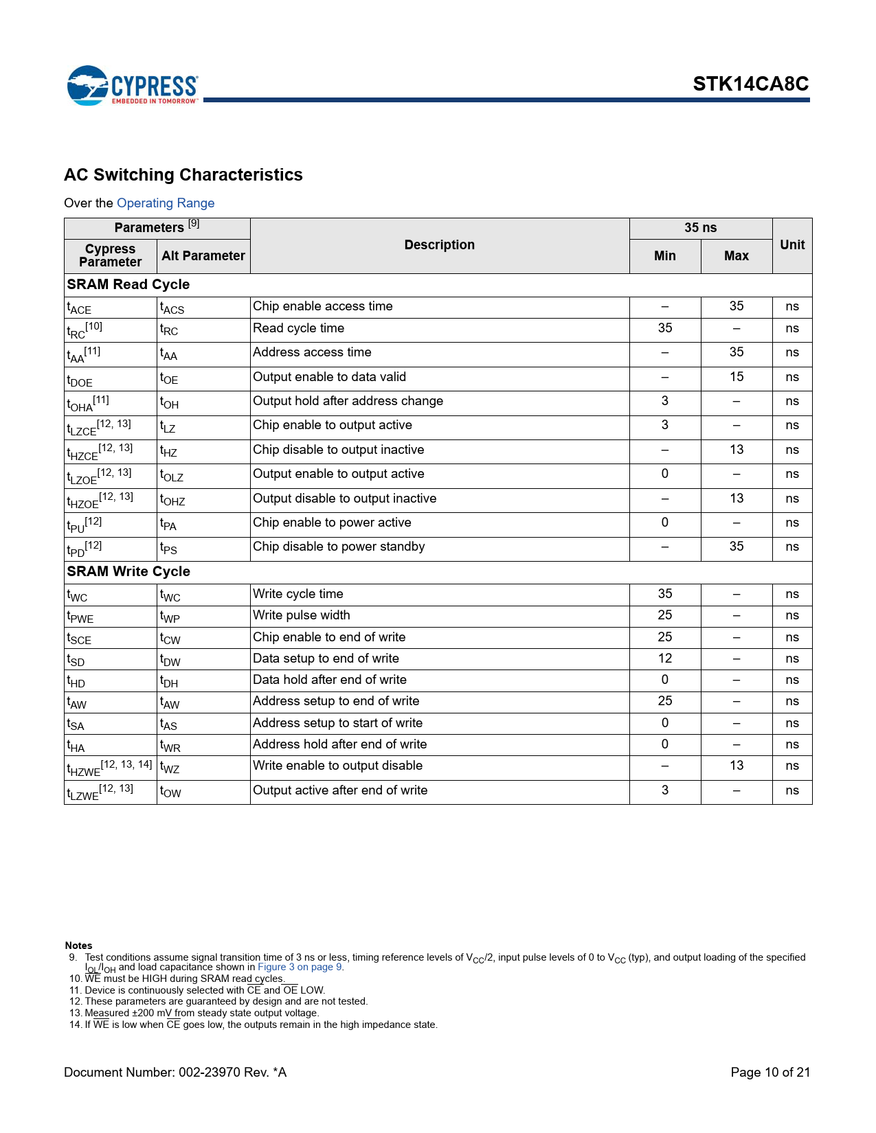 STK14CA8C. AC Switching Characteristics. Parameters. 35 ns. Description. Unit. Cypress. Parameter. Alt Parameter. Min. Max. SRAM Read Cycle