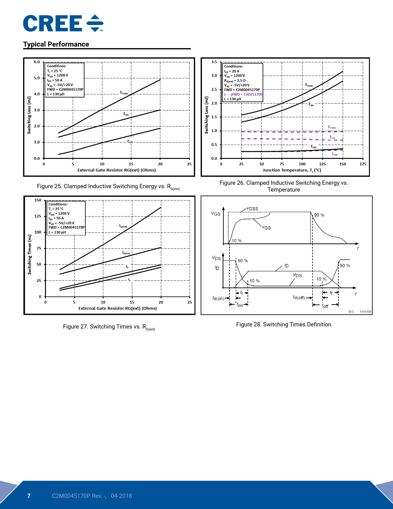 150 Conditions: TJ = 25 °C 125 VDD = 1200 V IDS = 50 A VGS = -5V/+20 V td(off) FWD = C2M0045170P 100 L = 130 μH es (ns) 75 td(on) 50 itching Tim tf Sw 25 tr 0 0 5 10 15 20 25 External Gate Resistor RG(ext) (Ohms)