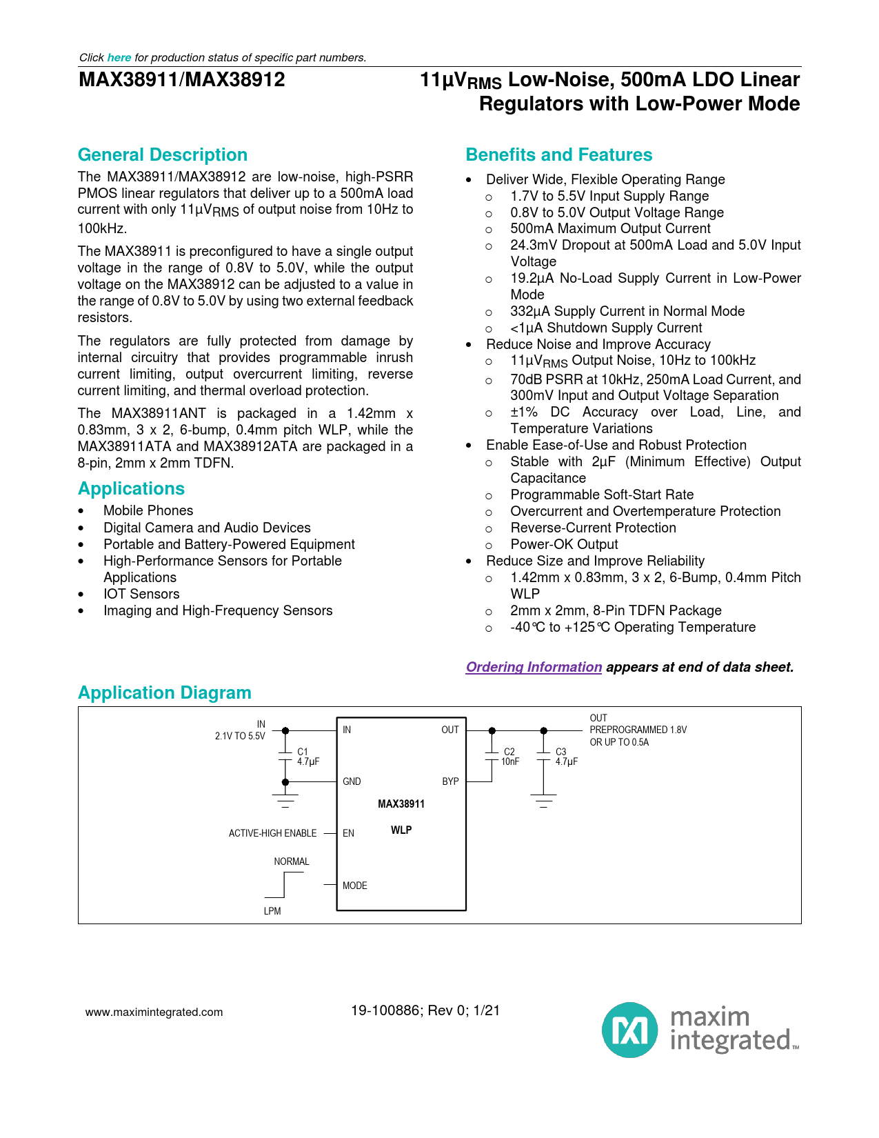 here. MAX38911/MAX38912. 11µVRMS Low-Noise, 500mA LDO Linear. Regulators with Low-Power Mode. General Description