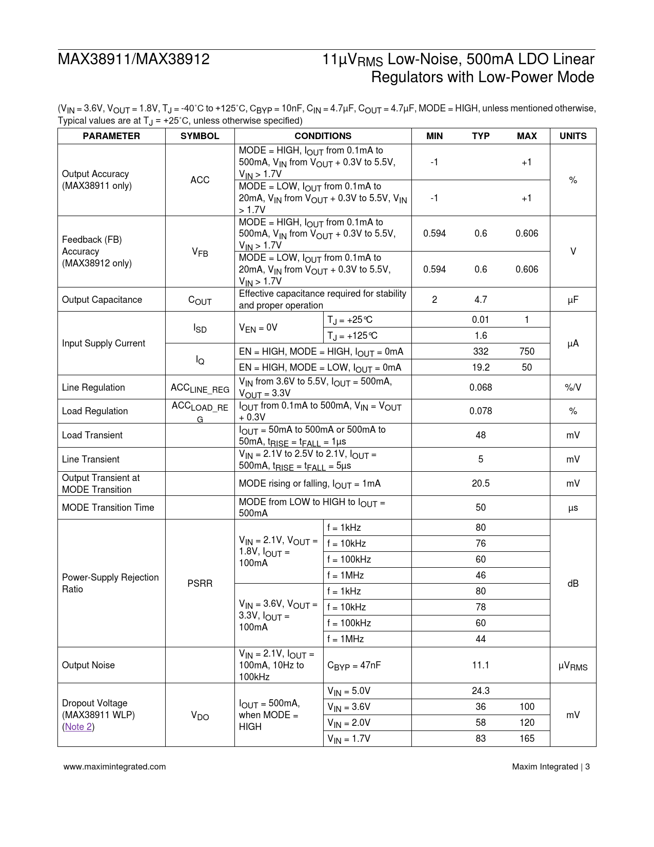 link to page 4 MAX38911/MAX38912 11µVRMS Low-Noise, 500mA LDO Linear Regulators with Low-Power Mode (VIN = 3.6V, VOUT = 1.8V, TJ = -40˚C to +125˚C, CBYP = 10nF, CIN = 4.7µF, COUT = 4.7µF, MODE = HIGH, unless mentioned otherwise, Typical values are at TJ = +25˚C, unless otherwise specified)