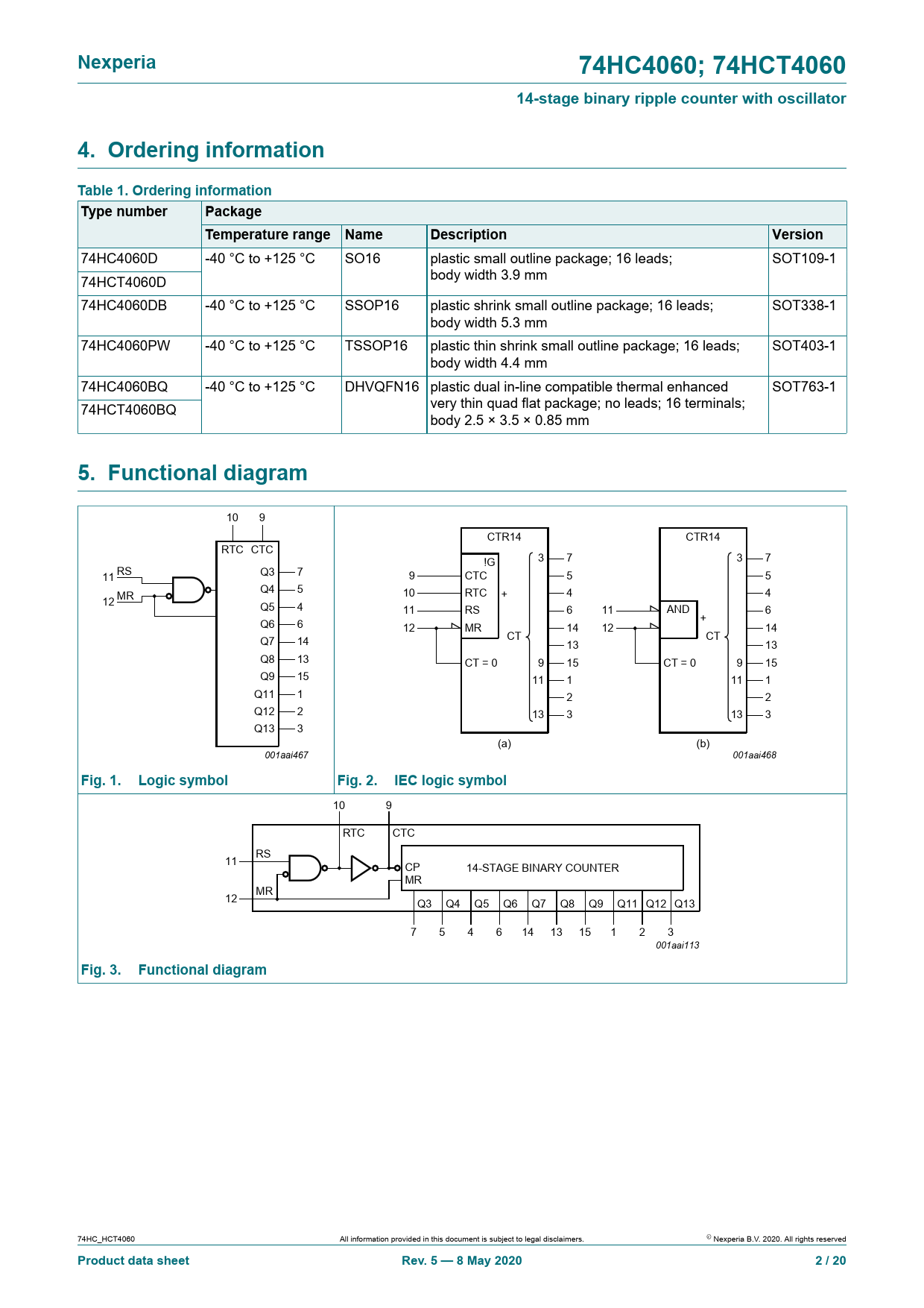 Nexperia 74HC4060; 74HCT4060 14-stage binary ripple counter with oscillator 4. Ordering information Table 1. Ordering information Type number Package Temperature range Name Description Version