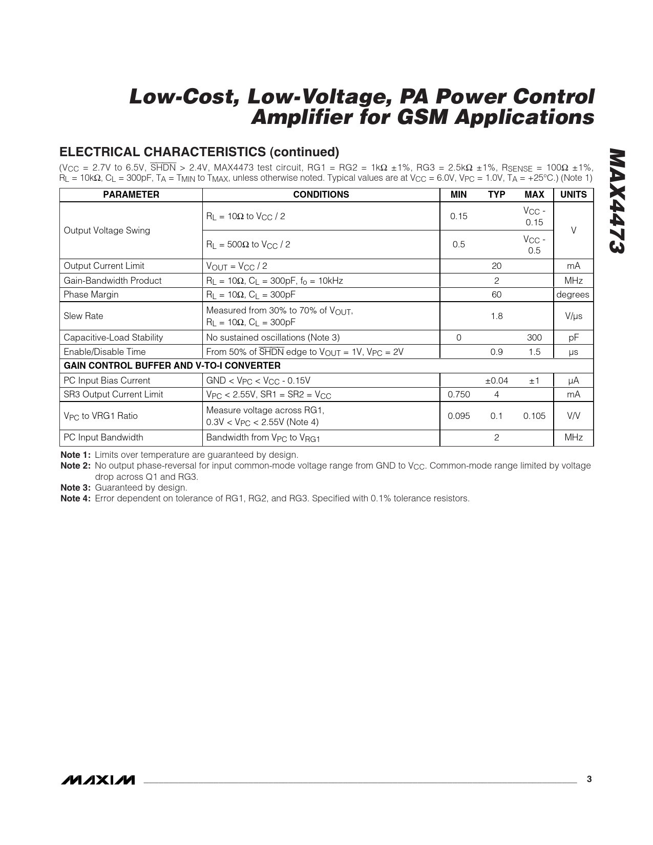 Low-Cost, Low-Voltage, PA Power ControlAmplifier for GSM ApplicationsMAX4473ELECTRICAL CHARACTERISTICS (continued) (VCC = 2.7V to 6.5V, SHDN > 2.4V, MAX4473 test circuit, RG1 = RG2 = 1kΩ ±1%, RG3 = 2.5kΩ ±1%, RSENSE = 100Ω ±1%, RL = 10kΩ, CL = 300pF, TA = TMIN to TMAX, unless otherwise noted. Typical values are at VCC = 6.0V, VPC = 1.0V, TA = +25°C.) (Note 1) PARAMETERCONDITIONSMINTYPMAXUNITS V R CC - L = 10Ω to VCC / 2 0.15 0.15 Output Voltage Swing V V R CC - L = 500Ω to VCC / 2 0.5 0.5 Output Current Limit VOUT = VCC / 2 20 mA Gain-Bandwidth Product RL = 10Ω, CL = 300pF, fo = 10kHz 2 MHz Phase Margin RL = 10Ω, CL = 300pF 60 degrees Measured from 30% to 70% of V Slew Rate OUT, 1.8 V/µs RL = 10Ω, CL = 300pF Capacitive-Load Stability No sustained oscillations (Note 3) 0 300 pF Enable/Disable Time From 50% of SHDN edge to VOUT = 1V, VPC = 2V 0.9 1.5 µs GAIN CONTROL BUFFER AND V-TO-I CONVERTER PC Input Bias Current GND < VPC < VCC - 0.15V ±0.04 ±1 µA SR3 Output Current Limit VPC < 2.55V, SR1 = SR2 = VCC 0.750 4 mA Measure voltage across RG1, VPC to VRG1 Ratio 0.095 0.1 0.105 V/V 0.3V < VPC < 2.55V (Note 4) PC Input Bandwidth Bandwidth from VPC to VRG1 2 MHz Note 1: Limits over temperature are guaranteed by design. Note 2: No output phase-reversal for input common-mode voltage range from GND to VCC. Common-mode range limited by voltage drop across Q1 and RG3. Note 3: Guaranteed by design. Note 4: Error dependent on tolerance of RG1, RG2, and RG3. Specified with 0.1% tolerance resistors. _______________________________________________________________________________________3
