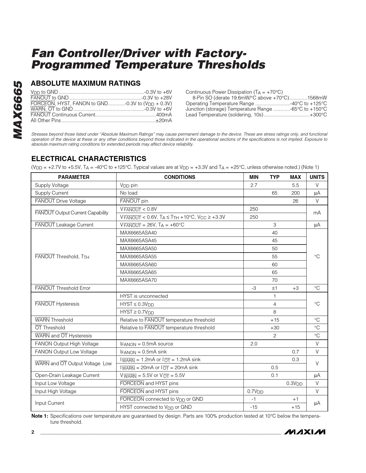 Fan Controller/Driver with Factory- Programmed Temperature ThresholdsABSOLUTE MAXIMUM RATINGS VDD to GND ..-0.3V to +6V Continuous Power Dissipation (TA = +70°C) FANOUT to GND ..-0.3V to +28V 8-Pin SO (derate 19.6mW/°C above +70°C)...1568mW FORCEON, HYST, FANON to GND..-0.3V to (VDD + 0.3V) Operating Temperature Range ...-40°C to +125°C WARN, OT to GND ...-0.3V to +6V Junction (storage) Temperature Range ..-65°C to +150°C FANOUT Continuous Current..400mA Lead Temperature (soldering, 10s) ...+300°C All Other Pins ..±20mA MAX6665 Stresses beyond those listed under “Absolute Maximum Ratings” may cause permanent damage to the device. These are stress ratings only, and functional operation of the device at these or any other conditions beyond those indicated in the operational sections of the specifications is not implied. Exposure to absolute maximum rating conditions for extended periods may affect device reliability. ELECTRICAL CHARACTERISTICS (VDD = +2.7V to +5.5V, TA = -40°C to +125°C. Typical values are at VDD = +3.3V and TA = +25°C, unless otherwise noted.) (Note 1) PARAMETERCONDITIONSMINTYPMAXUNITS Supply Voltage VDD pin 2.7 5.5 V Supply Current No load 65 200 µA FANOUT Drive Voltage FANOUT pin 26 V V FANOUT < 0.8V 250 FAN OUT Outp ut C ur r ent C ap ab i l i ty mA V FANOUT < 0.6V, TA ≤ TTH +10°C, VCC ≥ +3.3V 250 FANOUT Leakage Current V FANOUT = 26V, TA = +60°C 3 µA MAX6665ASA40 40 MAX6665ASA45 45 MAX6665ASA50 50 FANOUT Threshold, TTH MAX6665ASA55 55 °C MAX6665ASA60 60 MAX6665ASA65 65 MAX6665ASA70 70 FANOUT Threshold Error -3 ±1 +3 °C HYST is unconnected 1 FANOUT Hysteresis HYST ≤ 0.3VDD 4 °C HYST ≥ 0.7VDD 8 WARN Threshold Relative to FANOUT temperature threshold +15 °C OT Threshold Relative to FANOUT temperature threshold +30 °C WARN and OT Hysteresis 2 °C FANON Output High Voltage IFANON = 0.5mA source 2.0 V FANON Output Low Voltage IFANON = 0.5mA sink 0.7 V I WARN = 1.2mA or I OT = 1.2mA sink 0.3 W ARN and O T Outp ut V ol tag e Low V I WARN = 20mA or I OT = 20mA sink 0.5 Open-Drain Leakage Current V WARN = 5.5V or V OT = 5.5V 0.1 µA Input Low Voltage FORCEON and HYST pins 0.3VDD V Input High Voltage FORCEON and HYST pins 0.7VDD V FORCEON connected to VDD or GND -1 +1 Input Current µA HYST connected to VDD or GND -15 +15 Note 1: Specifications over temperature are guaranteed by design. Parts are 100% production tested at 10°C below the tempera- ture threshold. 2_______________________________________________________________________________________