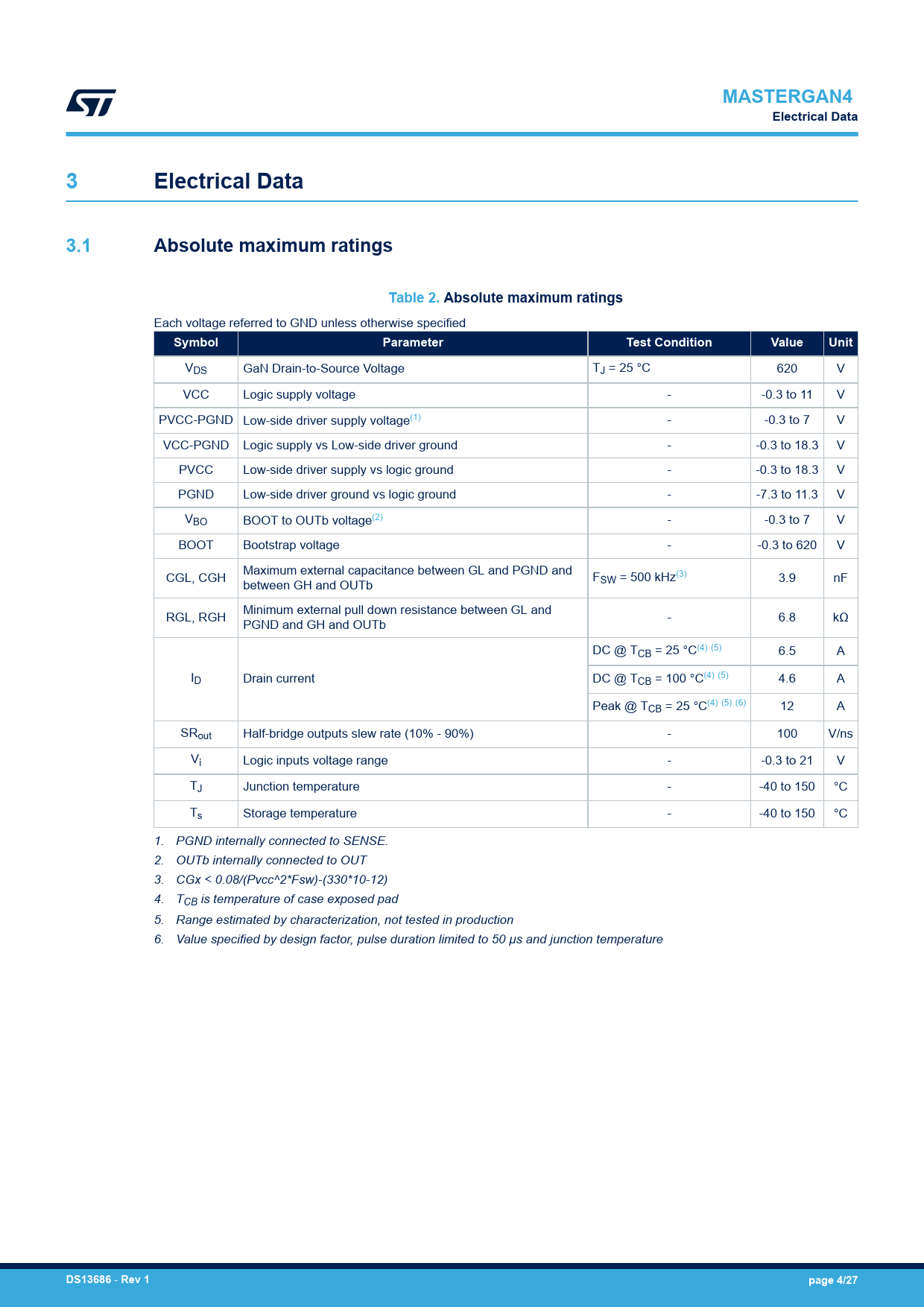 link to page 4 link to page 4 link to page 4 link to page 4 link to page 4 link to page 4 link to page 4 link to page 4 link to page 4 link to page 4 MASTERGAN4Electrical Data3Electrical Data3.1Absolute maximum ratingsTable 2. Absolute maximum ratings Each voltage referred to GND unless otherwise specified SymbolParameterTest ConditionValueUnit VDS GaN Drain-to-Source Voltage TJ = 25 °C 620 V VCC Logic supply voltage - -0.3 to 11 V PVCC-PGND Low-side driver supply voltage(1) - -0.3 to 7 V VCC-PGND Logic supply vs Low-side driver ground - -0.3 to 18.3 V PVCC Low-side driver supply vs logic ground - -0.3 to 18.3 V PGND Low-side driver ground vs logic ground - -7.3 to 11.3 V VBO BOOT to OUTb voltage(2) - -0.3 to 7 V BOOT Bootstrap voltage - -0.3 to 620 V Maximum external capacitance between GL and PGND and CGL, CGH F between GH and OUTb SW = 500 kHz(3) 3.9 nF Minimum external pull down resistance between GL and RGL, RGH - 6.8 kΩ PGND and GH and OUTb DC @ TCB = 25 °C(4) (5) 6.5 A ID Drain current DC @ TCB = 100 °C(4) (5) 4.6 A Peak @ TCB = 25 °C(4) (5) (6) 12 A SRout Half-bridge outputs slew rate (10% - 90%) - 100 V/ns Vi Logic inputs voltage range - -0.3 to 21 V TJ Junction temperature - -40 to 150 °C Ts Storage temperature - -40 to 150 °C 1. PGND internally connected to SENSE. 2. OUTb internally connected to OUT 3. CGx < 0.08/(Pvcc^2*Fsw)-(330*10-12) 4. TCB is temperature of case exposed pad 5. Range estimated by characterization, not tested in production 6. Value specified by design factor, pulse duration limited to 50 µs and junction temperature DS13686 - Rev 1page 4/27 Document Outline Features Applications Description 1 Block diagram 2 Pin descriptions and connection diagram 2.1 Pin list 3 Electrical Data 3.1 Absolute maximum ratings 3.2 Recommended operating conditions 3.3 Thermal data 4 Electrical characteristics 4.1 Driver 4.2 GaN power transistor 5 Device characterization values 6 Functional description 6.1 Logic inputs 6.2 Bootstrap structure 6.3 VCC supply pins and UVLO function 6.4 VBO UVLO protection 6.5 Thermal shutdown 7 Typical application diagrams 8 Package information 8.1 QFN 9 x 9 x 1 mm, 31 leads, pitch 0.6 mm package information 9 Suggested footprint 10 Ordering information Revision history