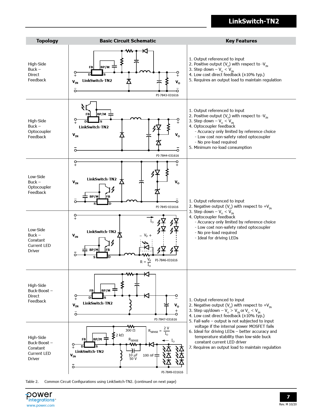 LinkSwitch-TN2TopologyBasic Circuit SchematicKey Features 1. Output referenced to input High-Side 2. Positive output (V ) with respect to -V O IN Buck – FBBP/M 3. Step down – V < V O IN Direct + DS + 4. Low cost direct feedback (±10% typ.) Feedback LinkSwitch-TN2 5. Requires an output load to maintain regulation VINVO PI-7843-031616 1. Output referenced to input FBBP/M 2. Positive output (V ) with respect to -V O IN High-Side DS 3. Step down – V < V + + O IN Buck – LinkSwitch-TN2 4. Optocoupler feedback Optocoupler - Accuracy only limited by reference choice Feedback VVINO - Low cost non-safety rated optocoupler - No pre-load required 5. Minimum no-load consumption PI-7844-031616 + + Low-Side LinkSwitch-TN2 Buck – VVINO Optocoupler Feedback BP/MFB 1. Output referenced to input SD PI-7845-031616 2. Negative output (V ) with respect to +V O IN 3. Step down – V < V O IN 4. Optocoupler feedback + IO - Accuracy only limited by reference choice - Low cost non-safety rated optocoupler Low-Side LinkSwitch-TN2 - No pre-load required Buck – V V IN F + - Ideal for driving LEDs Constant Current LED Driver BP/MFBSD VF PI-7846-031616 R = IO High-Side Buck-Boost – FBBP/M Direct DS Feedback + 1. Output referenced to input VLinkSwitch-TN2VINO 2. Negative output (V ) with respect to +V O IN + 3. Step up/down – V > V or V < V O IN O IN 4. Low cost direct feedback (±10% typ.) PI-7847-031616 5. Fail-safe – output is not subjected to input voltage if the internal power MOSFET fails 300 2 V Ω RSENSE = 6. Ideal for driving LEDs – better accuracy and IO High-Side 2 kΩ temperature stability than low-side buck FBBP/M R Buck-Boost – SENSE IO constant current LED driver Constant + DS 7. Requires an output load to maintain regulation Current LED LinkSwitch-TN2V 10 µF IN 100 nF Driver 50 V PI-7849-031616 Table 2. Common Circuit Configurations using LinkSwitch-TN2. (continued on next page) 7 Rev. M 10/20 www.power.com Document Outline Product Highlights Description Output Current Table Pin Functional Description LinkSwitch-TN2 Functional Description Applications Example Key Application Considerations Quick Design Checklist Absolute Maximum Ratings Thermal Resistance Key Electrical Characteristics Typical Performance Characteristics PDIP-8C (P Package) SMD-8C (G Package) SO-8C (D Package) PDIP-8C (P) and SMD-8C Package Marking SO-8C (D) Package Marking MSL Table ESD and Latch-Up Part Ordering Information