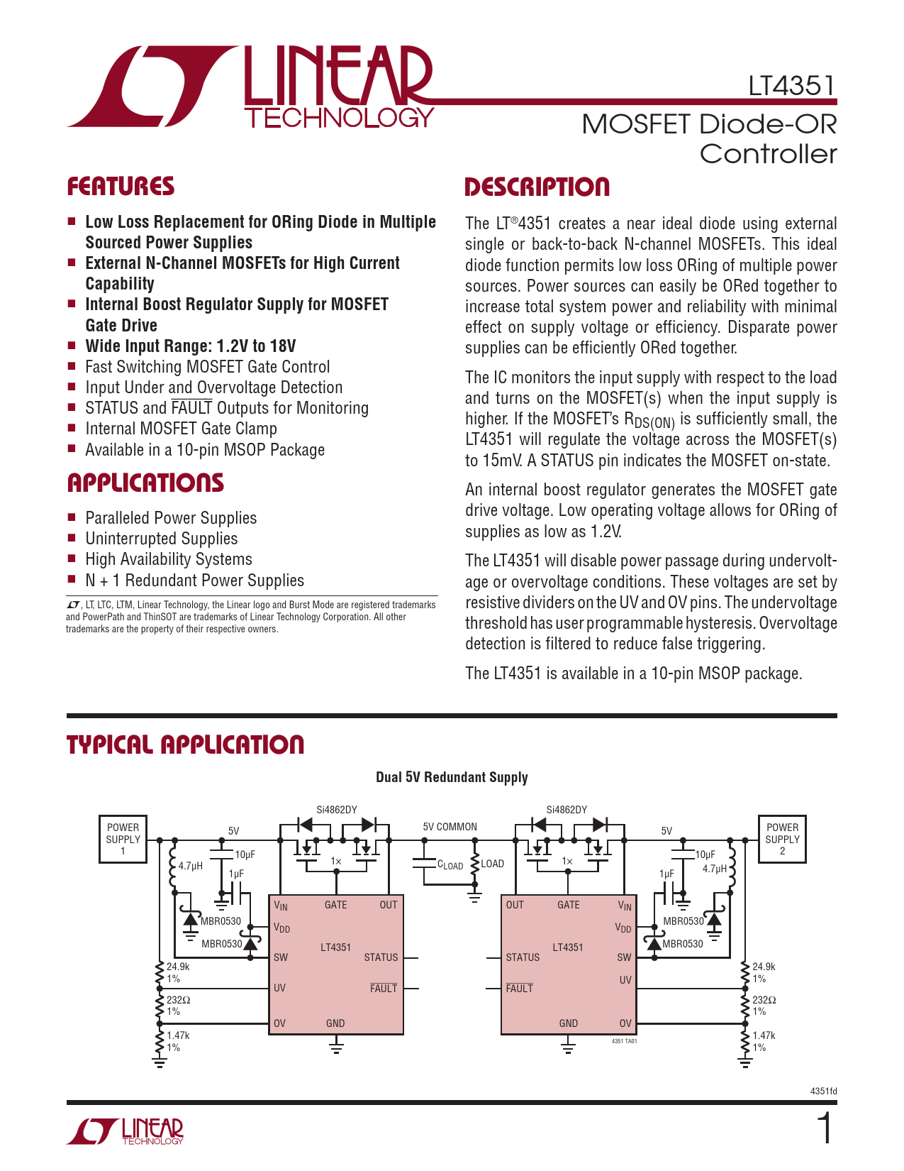 supplies can be efficiently ORed together. n Fast Switching MOSFET Gate Control The IC monitors the input supply with respect to the load n Input Under and Overvoltage Detection and turns on the MOSFET(s) when the input supply is n STATUS and FAULT Outputs for Monitoring higher. If the MOSFET’s R n DS(ON) is sufficiently small, the Internal MOSFET Gate Clamp LT4351 will regulate the voltage across the MOSFET(s) n Available in a 10-pin MSOP Package to 15mV. A STATUS pin indicates the MOSFET on-state.