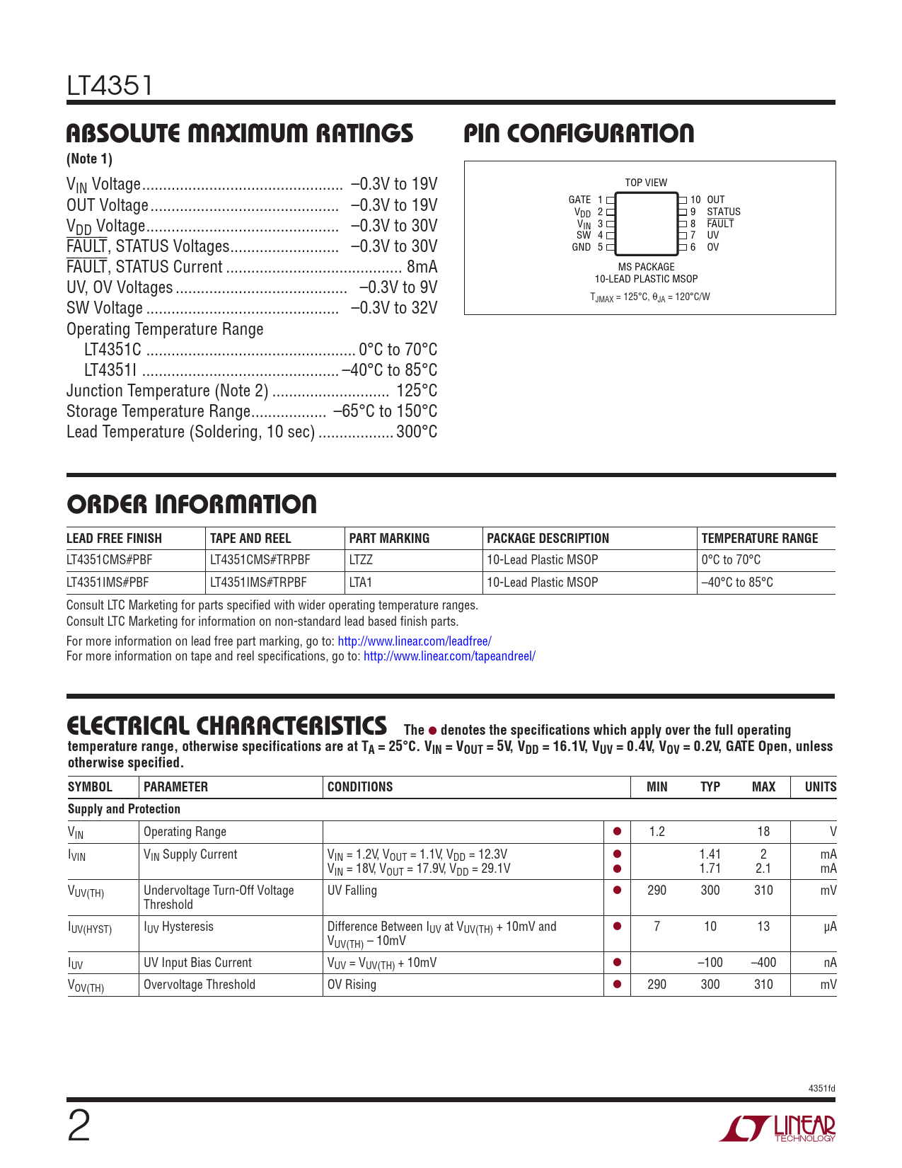 VIN Voltage .. –0.3V to 19V TOP VIEW OUT Voltage ... –0.3V to 19V GATE 1 10 OUT VDD 2 9 STATUS VDD Voltage .. –0.3V to 30V VIN 3 8 FAULT FAULT, STATUS Voltages .. –0.3V to 30V SW 4 7 UV GND 5 6 OV FAULT, STATUS Current .. 8mA MS PACKAGE UV, OV Voltages ... –0.3V to 9V 10-LEAD PLASTIC MSOP SW Voltage .. –0.3V to 32V TJMAX = 125°C, θJA = 120°C/W Operating Temperature Range LT4351C .. 0°C to 70°C LT4351I ... –40°C to 85°C Junction Temperature (Note 2) .. 125°C Storage Temperature Range .. –65°C to 150°C Lead Temperature (Soldering, 10 sec) .. 300°C