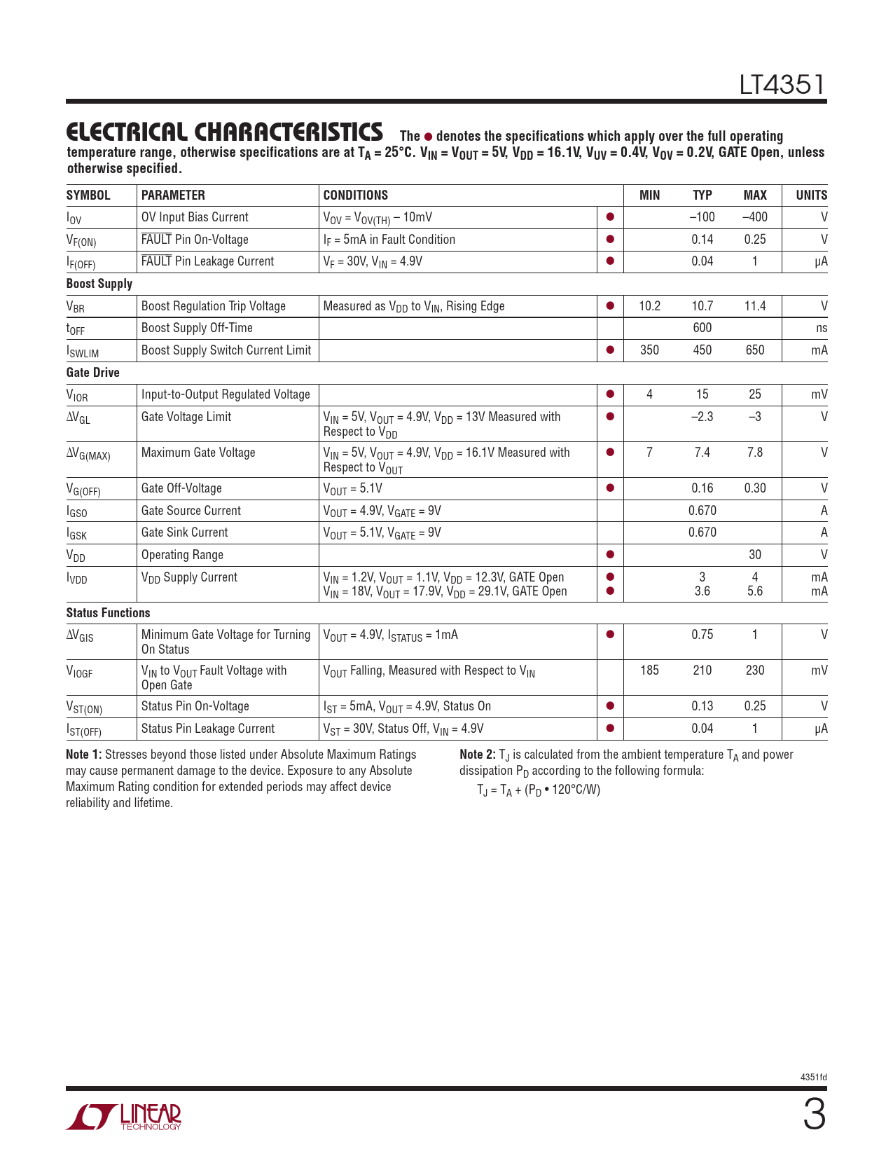 denotes the specifications which apply over the full operating temperature range, otherwise specifications are at TA = 25°C. VIN = VOUT = 5V, VDD = 16.1V, VUV = 0.4V, VOV = 0.2V, GATE Open, unless otherwise specified. SYMBOL PARAMETER CONDITIONS MIN TYP MAX UNITS
