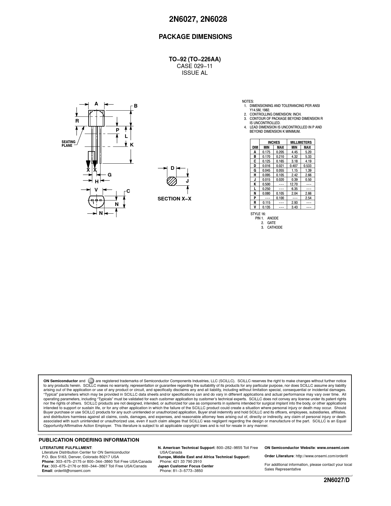 2N6027, 2N6028PACKAGE DIMENSIONSTO−92 (TO−226AA) CASE 029−11 ISSUE AL NOTES: AB 1. DIMENSIONING AND TOLERANCING PER ANSI Y14.5M, 1982. 2. CONTROLLING DIMENSION: INCH. 3. CONTOUR OF PACKAGE BEYOND DIMENSION R R IS UNCONTROLLED. 4. LEAD DIMENSION IS UNCONTROLLED IN P AND P BEYOND DIMENSION K MINIMUM. L SEATING INCHES MILLIMETERS PLANE K DIM MIN MAX MIN MAX A 0.175 0.205 4.45 5.20 B 0.170 0.210 4.32 5.33 C 0.125 0.165 3.18 4.19 D D 0.016 0.021 0.407 0.533 X X G 0.045 0.055 1.15 1.39 G H 0.095 0.105 2.42 2.66 HJ J 0.015 0.020 0.39 0.50 K 0.500 −−− 12.70 −−− V L 0.250 −−− 6.35 −−− C N 0.080 0.105 2.04 2.66 SECTION X−X P −−− 0.100 −−− 2.54 1 N R 0.115 −−− 2.93 −−− V 0.135 −−− 3.43 −−− N STYLE 16: PIN 1. ANODE 2. GATE 3. CATHODE ON Semiconductor and are registered trademarks of Semiconductor Components Industries, LLC (SCILLC). SCILLC reserves the right to make changes without further notice to any products herein. SCILLC makes no warranty, representation or guarantee regarding the suitability of its products for any particular purpose, nor does SCILLC assume any liability arising out of the application or use of any product or circuit, and specifically disclaims any and all liability, including without limitation special, consequential or incidental damages. “Typical” parameters which may be provided in SCILLC data sheets and/or specifications can and do vary in different applications and actual performance may vary over time. All operating parameters, including “Typicals” must be validated for each customer application by customer’s technical experts. SCILLC does not convey any license under its patent rights nor the rights of others. SCILLC products are not designed, intended, or authorized for use as components in systems intended for surgical implant into the body, or other applications intended to support or sustain life, or for any other application in which the failure of the SCILLC product could create a situation where personal injury or death may occur. Should Buyer purchase or use SCILLC products for any such unintended or unauthorized application, Buyer shall indemnify and hold SCILLC and its officers, employees, subsidiaries, affiliates, and distributors harmless against all claims, costs, damages, and expenses, and reasonable attorney fees arising out of, directly or indirectly, any claim of personal injury or death associated with such unintended or unauthorized use, even if such claim alleges that SCILLC was negligent regarding the design or manufacture of the part. SCILLC is an Equal Opportunity/Affirmative Action Employer. This literature is subject to all applicable copyright laws and is not for resale in any manner. PUBLICATION ORDERING INFORMATIONLITERATURE FULFILLMENT : N. American Technical Support : 800−282−9855 Toll Free ON Semiconductor Website : www.onsemi.com Literature Distribution Center for ON Semiconductor USA/Canada P.O. Box 5163, Denver, Colorado 80217 USA Europe, Middle East and Africa Technical Support:Order Literature : http://www.onsemi.com/orderlit Phone : 303−675−2175 or 800−344−3860 Toll Free USA/Canada Phone: 421 33 790 2910 Fax : 303−675−2176 or 800−344−3867 Toll Free USA/Canada Japan Customer Focus Center For additional information, please contact your local Email : orderlit@onsemi.com Phone: 81−3−5773−3850 Sales Representative http://onsemi.com2N6027/D6