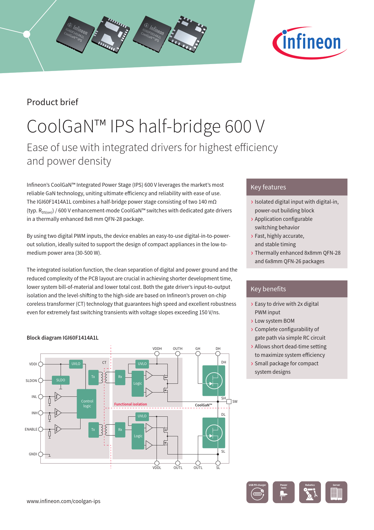Product brief CoolGaN™ IPS half-bridge 600 V Ease of use with integrated drivers for highest efficiency and power density Infineon’s CoolGaN™ Integrated Power Stage (IPS) 600 V leverages the market’s most Key features reliable GaN technology, uniting ultimate efficiency and reliability with ease of use. The IGI60F1414A1L combines a half-bridge power stage consisting of two 140 mΩ ›Isolated digital input with digital-in, (typ. RDS(on)) / 600 V enhancement-mode CoolGaN™ switches with dedicated gate drivers power-out building block in a thermally enhanced 8x8 mm QFN-28 package. ›Application configurable switching behavior By using two digital PWM inputs, the device enables an easy-to-use digital-in-to-power- ›Fast, highly accurate, out solution, ideally suited to support the design of compact appliances in the low-to- and stable timing medium power area (30-500 W). ›Thermally enhanced 8x8mm QFN-28 and 6x8mm QFN-26 packages The integrated isolation function, the clean separation of digital and power ground and the reduced complexity of the PCB layout are crucial in achieving shorter development time, lower system bill-of-material and lower total cost. Both the gate driver’s input-to-output Key benefits isolation and the level-shifting to the high-side are based on Infineon’s proven on-chip coreless transformer (CT) technology that guarantees high speed and excellent robustness ›Easy to drive with 2x digital even for extremely fast switching transients with voltage slopes exceeding 150 V/ns. PWM input ›Low system BOM ›Complete configurability of