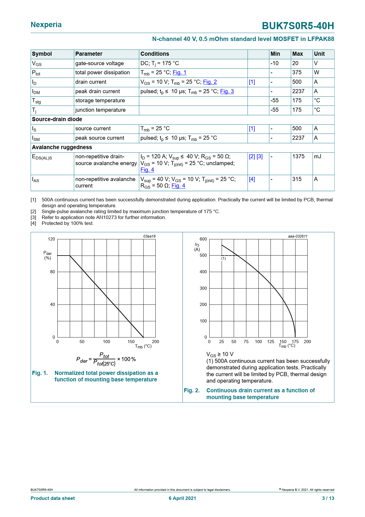 VGS gate-source voltage DC; Tj = 175 °C -10 20 V Ptot total power dissipation Tmb = 25 °C; Fig. 1 - 375 W ID drain current VGS = 10 V; Tmb = 25 °C; Fig. 2 [1] - 500 A IDM peak drain current pulsed; tp ≤ 10 µs; Tmb = 25 °C; Fig. 3 - 2237 A Tstg storage temperature -55 175 °C Tj junction temperature -55 175 °C
