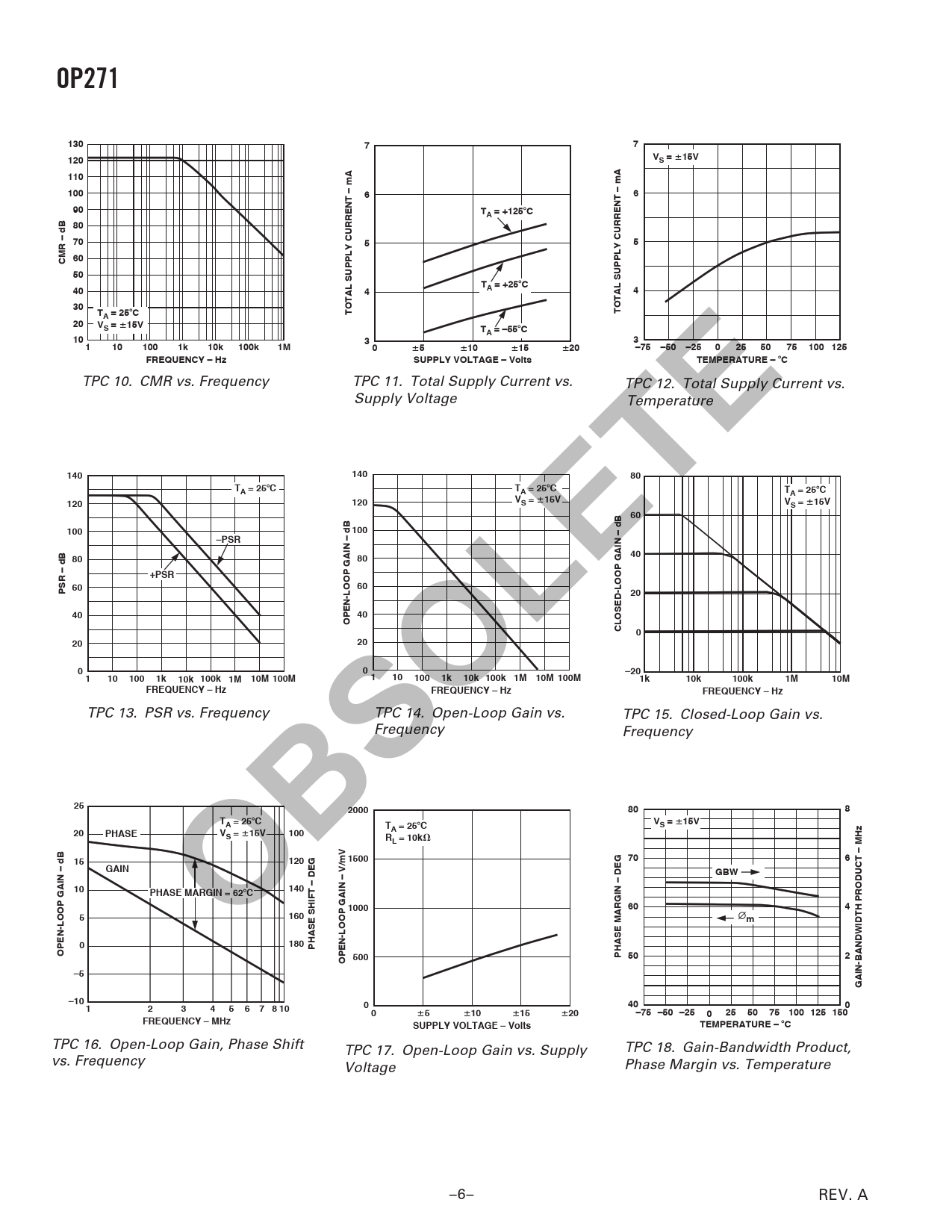 OP27113077120VS =15V1101006690TA = +125C807055CMR – dB 6050T404A = +25C430TTOTAL SUPPLY CURRENT – mATOTAL SUPPLY CURRENT – mAA = 25C20VS =15VTA = –55C10331101001k10k100k1M05101520–75–50–250255075100 125FREQUENCY – HzSUPPLY VOLTAGE – VoltsTEMPERATURE –C TPC 10. CMR vs. Frequency TPC 11. Total Supply Current vs. TPC 12. Total Supply Current vs. Supply Voltage Temperature 14014080TA = 25CTA = 25CTA = 25C120120VS =15VVS =15V60100100–PSR408080+PSR60PSR – dB 60204040OPEN-LOOP GAIN – dBCLOSED-LOOP GAIN – dB0202000–201101001k10k 100k 1M10M 100M1101001k10k 100k 1M 10M 100M1k10k100k1M10MFREQUENCY – HzFREQUENCY – HzFREQUENCY – Hz TPC 13. PSR vs. Frequency TPC 14. Open-Loop Gain vs. TPC 15. Closed-Loop Gain vs. Frequency Frequency 252000808TA = 25CTVS =15V20PHASEVA = 25CS =15V100RL = 10k151201500706GAINGBWOBSOLETE10140PHASE MARGIN = 62C10006045160m0180PHASE SHIFT – DEGOPEN-LOOP GAIN – dBPHASE MARGIN – DEG 502OPEN-LOOP GAIN – V/mV 500–5GAIN-BANDWIDTH PRODUCT – MHz–10 123456 7 8 10040005101520–75 –50 –250255075 100 125 150FREQUENCY – MHzSUPPLY VOLTAGE – VoltsTEMPERATURE –C TPC 16. Open-Loop Gain, Phase Shift TPC 17. Open-Loop Gain vs. Supply TPC 18. Gain-Bandwidth Product, vs. Frequency Voltage Phase Margin vs. Temperature –6– REV. A Document Outline FEATURES GENERAL DESCRIPTION PIN CONNECTIONS SPECIFICATIONS ABSOLUTE MAXIMUM RATINGS ORDERING GUIDE Typical Performance Characteristics APPLICATION INFORMATION Capacitive Load Driving and Power Supply Considerations Unity-Gain Buffer Applications Computer Simulations APPLICATIONS Low Phase Error Amplifier Dual 12-Bit Voltage Output DAC Fast Current Pump OUTLINE DIMENSIONS Revision History