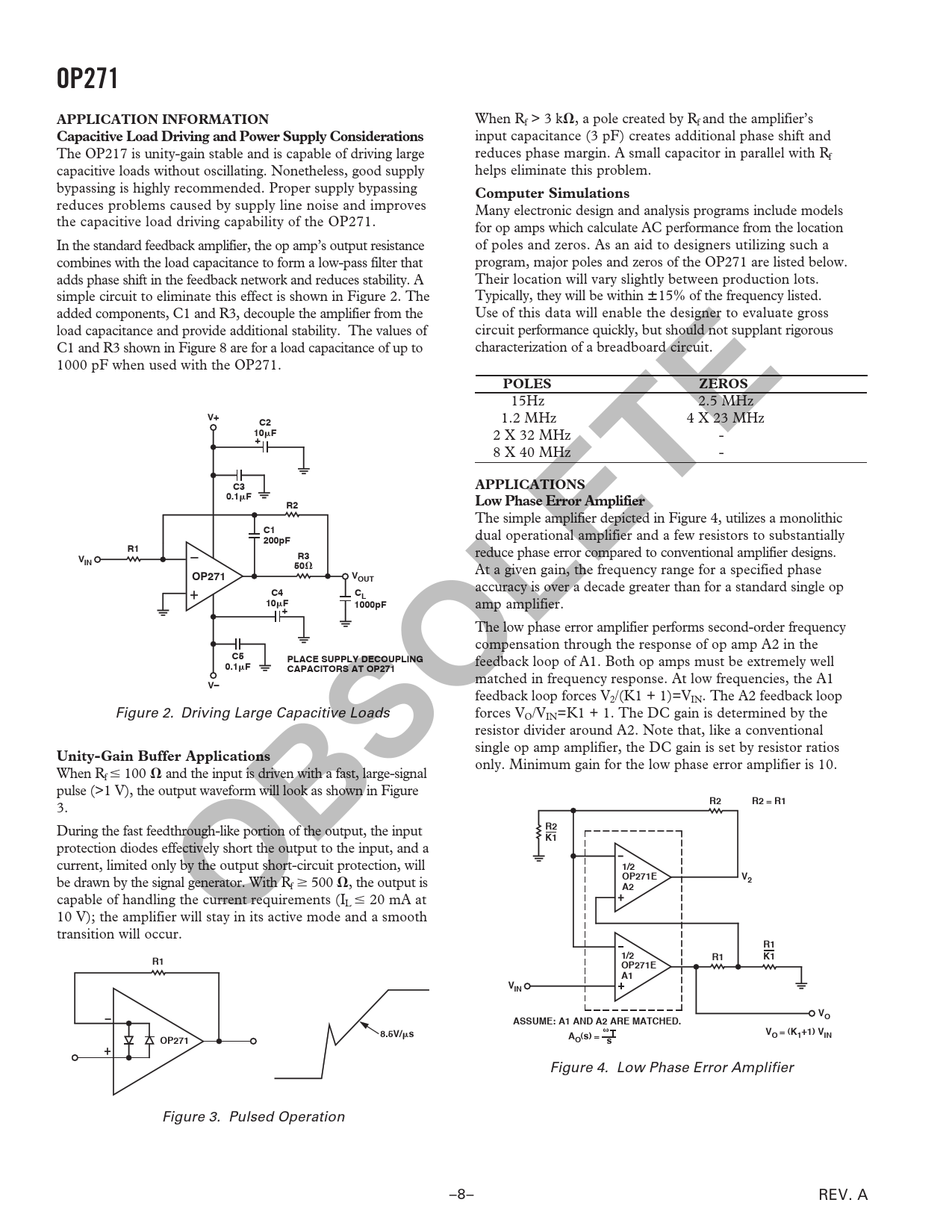 OP271APPLICATION INFORMATION When Rf > 3 k⍀, a pole created by Rf and the amplifier’s Capacitive Load Driving and Power Supply Considerations input capacitance (3 pF) creates additional phase shift and The OP217 is unity-gain stable and is capable of driving large reduces phase margin. A small capacitor in parallel with Rf capacitive loads without oscillating. Nonetheless, good supply helps eliminate this problem. bypassing is highly recommended. Proper supply bypassing Computer Simulations reduces problems caused by supply line noise and improves Many electronic design and analysis programs include models the capacitive load driving capability of the OP271. for op amps which calculate AC performance from the location In the standard feedback amplifier, the op amp’s output resistance of poles and zeros. As an aid to designers utilizing such a combines with the load capacitance to form a low-pass filter that program, major poles and zeros of the OP271 are listed below. adds phase shift in the feedback network and reduces stability. A Their location will vary slightly between production lots. simple circuit to eliminate this effect is shown in Figure 2. The Typically, they will be within ⴞ15% of the frequency listed. added components, C1 and R3, decouple the amplifier from the Use of this data will enable the designer to evaluate gross load capacitance and provide additional stability. The values of circuit performance quickly, but should not supplant rigorous C1 and R3 shown in Figure 8 are for a load capacitance of up to characterization of a breadboard circuit. 1000 pF when used with the OP271. POLESZEROS 15Hz 2.5 MHz V+C2 1.2 MHz 4 X 23 MHz 10 F 2 X 32 MHz - + 8 X 40 MHz - C3APPLICATIONS0.1 FR2Low Phase Error Amplifier The simple amplifier depicted in Figure 4, utilizes a monolithic C1 dual operational amplifier and a few resistors to substantially 200pFR1 reduce phase error compared to conventional amplifier designs. VR3IN50 ⍀ At a given gain, the frequency range for a specified phase OP271VOUT accuracy is over a decade greater than for a standard single op C4CL10 F1000pF amp amplifier. + The low phase error amplifier performs second-order frequency compensation through the response of op amp A2 in the C5PLACE SUPPLY DECOUPLING0.1 F feedback loop of A1. Both op amps must be extremely well CAPACITORS AT OP271 matched in frequency response. At low frequencies, the A1 V– feedback loop forces V2/(K1 + 1)=VIN. The A2 feedback loop Figure 2. Driving Large Capacitive Loads forces VO/VIN=K1 + 1. The DC gain is determined by the resistor divider around A2. Note that, like a conventional single op amp amplifier, the DC gain is set by resistor ratios Unity-Gain Buffer Applications only. Minimum gain for the low phase error amplifier is 10. When Rf ⱕ 100 ⍀ and the input is driven with a fast, large-signal pulse (>1 V), the output waveform will look as shown in Figure R2R2 = R1 3. R2 During the fast feedthrough-like portion of the output, the input K1 protection diodes effectively short the output to the input, and a current, limited only by the output short-circuit protection, will 1/2 OP271EV2 be drawn by the signal generator. With R OBSOLETE f ⱖ 500 ⍀, the output is A2 capable of handling the current requirements (IL ⱕ 20 mA at 10 V); the amplifier will stay in its active mode and a smooth transition will occur. R11/2R1K1R1OP271E A1VINVOASSUME: A1 AND A2 ARE MATCHED. 8.5V/ sAVO = (K1+1) VINO(s) =OP271s Figure 4. Low Phase Error Amplifier Figure 3. Pulsed Operation –8– REV. A Document Outline FEATURES GENERAL DESCRIPTION PIN CONNECTIONS SPECIFICATIONS ABSOLUTE MAXIMUM RATINGS ORDERING GUIDE Typical Performance Characteristics APPLICATION INFORMATION Capacitive Load Driving and Power Supply Considerations Unity-Gain Buffer Applications Computer Simulations APPLICATIONS Low Phase Error Amplifier Dual 12-Bit Voltage Output DAC Fast Current Pump OUTLINE DIMENSIONS Revision History