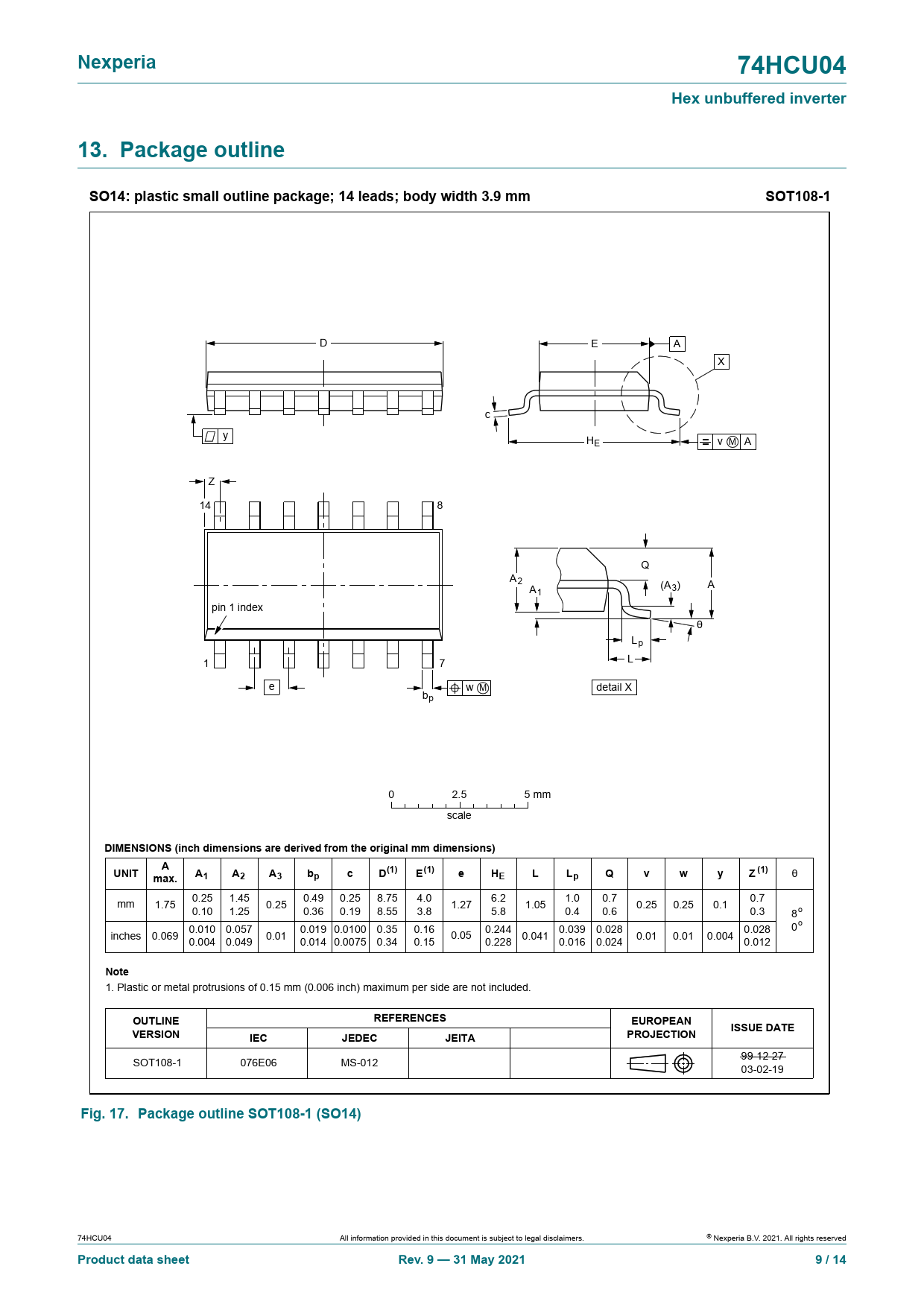 | 页数 / 页 | 14 / 9 — Nexperia. 74HCU04. Hex unbuffered inverter. 13. Package outline |