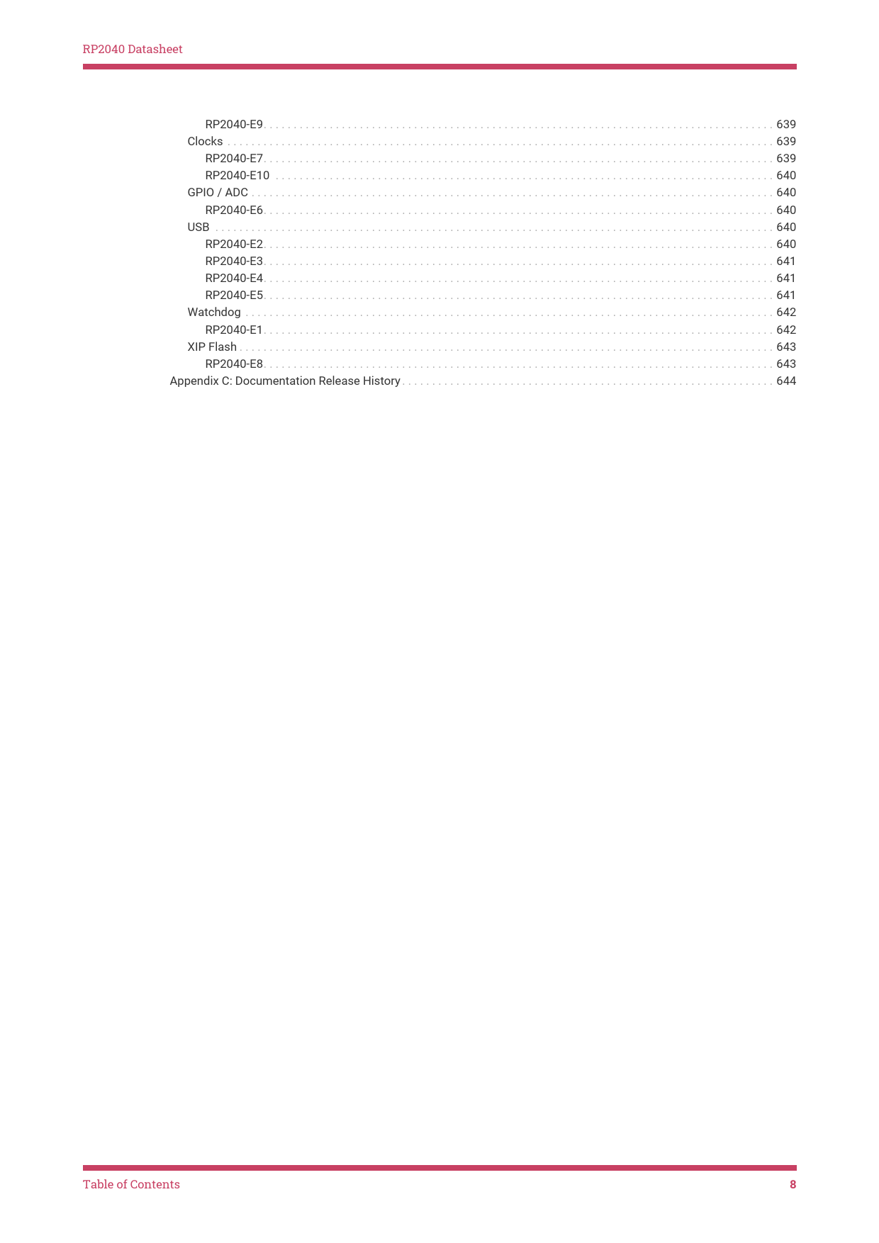link to page 640 link to page 640 link to page 640 link to page 640 link to page 640 link to page 640 link to page 641 link to page 641 link to page 641 link to page 641 link to page 641 link to page 641 link to page 641 link to page 641 link to page 641 link to page 641 link to page 642 link to page 642 link to page 642 link to page 642 link to page 642 link to page 642 link to page 643 link to page 643 link to page 643 link to page 643 link to page 644 link to page 644 link to page 644 link to page 644 link to page 645 link to page 645 RP2040 Datasheet RP2040-E9. 639 Clocks . 639 RP2040-E7. 639 RP2040-E10 . 640 GPIO / ADC . 640 RP2040-E6. 640 USB . 640 RP2040-E2. 640 RP2040-E3. 641 RP2040-E4. 641 RP2040-E5. 641 Watchdog . 642 RP2040-E1. 642 XIP Flash . 643 RP2040-E8. 643 Appendix C: Documentation Release History . 644 Table of Contents 8 Document Outline RP2040 Datasheet Colophon Legal Disclaimer Notice Table of Contents Chapter 1. Introduction 1.1. Why is the chip called RP2040? 1.2. Summary 1.3. The Chip 1.4. Pinout Reference 1.4.1. Pin Locations 1.4.2. Pin Descriptions 1.4.3. GPIO Functions Chapter 2. System Description 2.1. Bus Fabric 2.1.1. AHB-Lite Crossbar 2.1.2. Atomic Register Access 2.1.3. APB Bridge 2.1.4. Narrow IO Register Writes 2.1.5. List of Registers 2.2. Address Map 2.2.1. Summary 2.2.2. Detail 2.3. Processor subsystem 2.3.1. SIO 2.3.2. Interrupts 2.3.3. Event Signals 2.3.4. Debug 2.4. Cortex-M0+ 2.4.1. Features 2.4.2. Functional Description 2.4.3. Programmer’s model 2.4.4. System control 2.4.5. NVIC 2.4.6. MPU 2.4.7. Debug 2.4.8. List of Registers 2.5. DMA 2.5.1. Configuring Channels 2.5.2. Starting Channels 2.5.3. Data Request (DREQ) 2.5.4. Interrupts 2.5.5. Additional Features 2.5.6. Example Use Cases 2.5.7. List of Registers 2.6. Memory 2.6.1. ROM 2.6.2. SRAM 2.6.3. Flash 2.7. Boot Sequence 2.8. Bootrom 2.8.1. Processor Controlled Boot Sequence 2.8.2. Bootrom Contents 2.8.3. USB Mass Storage Interface 2.8.4. USB PICOBOOT Interface 2.9. Power Supplies 2.9.1. Digital IO Supply (IOVDD) 2.9.2. Digital Core Supply (DVDD) 2.9.3. On-Chip Voltage Regulator Input Supply (VREG_VIN) 2.9.4. USB PHY Supply (USB_VDD) 2.9.5. ADC Supply (ADC_AVDD) 2.9.6. Power Supply Sequencing 2.9.7. Power Supply Schemes 2.10. Core Supply Regulator 2.10.1. Application Circuit 2.10.2. Operating Modes 2.10.3. Output Voltage Select 2.10.4. Status 2.10.5. Current Limit 2.10.6. List of Registers 2.10.7. Detailed Specifications 2.11. Power Control 2.11.1. Top-level Clock Gates 2.11.2. SLEEP State 2.11.3. DORMANT State 2.11.4. Memory Power Down 2.11.5. Programmer’s Model 2.12. Chip-Level Reset 2.12.1. Overview 2.12.2. Power-on Reset 2.12.3. Brown-out Detection 2.12.4. Supply Monitor 2.12.5. External Reset 2.12.6. Rescue Debug Port Reset 2.12.7. Source of Last Reset 2.12.8. List of Registers 2.13. Power-On State Machine 2.13.1. Overview 2.13.2. Power On Sequence 2.13.3. Register Control 2.13.4. Interaction with Watchdog 2.13.5. List of Registers 2.14. Subsystem Resets 2.14.1. Overview 2.14.2. Programmer’s Model 2.14.3. List of Registers 2.15. Clocks 2.15.1. Overview 2.15.2. Clock sources 2.15.3. Clock Generators 2.15.4. Frequency Counter 2.15.5. Resus 2.15.6. Programmer’s Model 2.15.7. List of Registers 2.16. Crystal Oscillator (XOSC) 2.16.1. Overview 2.16.2. Usage 2.16.3. Startup Delay 2.16.4. XOSC Counter 2.16.5. DORMANT mode 2.16.6. Programmer’s Model 2.16.7. List of Registers 2.17. Ring Oscillator (ROSC) 2.17.1. Overview 2.17.2. ROSC/XOSC trade-offs 2.17.3. Modifying the frequency 2.17.4. ROSC divider 2.17.5. Random Number Generator 2.17.6. ROSC Counter 2.17.7. DORMANT mode 2.17.8. List of Registers 2.18. PLL 2.18.1. Overview 2.18.2. Calculating PLL parameters 2.18.3. Configuration 2.18.4. List of Registers 2.19. GPIO 2.19.1. Overview 2.19.2. Function Select 2.19.3. Interrupts 2.19.4. Pads 2.19.5. Software Examples 2.19.6. List of Registers 2.20. Sysinfo 2.20.1. Overview 2.20.2. List of Registers 2.21. Syscfg 2.21.1. Overview 2.21.2. List of Registers 2.22. TBMAN 2.22.1. List of Registers Chapter 3. PIO 3.1. Overview 3.2. Programmer’s Model 3.2.1. PIO Programs 3.2.2. Control Flow 3.2.3. Registers 3.2.4. Stalling 3.2.5. Pin Mapping 3.2.6. IRQ Flags 3.2.7. Interactions Between State Machines 3.3. PIO Assembler (pioasm) 3.3.1. Directives 3.3.2. Values 3.3.3. Expressions 3.3.4. Comments 3.3.5. Labels 3.3.6. Instructions 3.3.7. Pseudoinstructions 3.4. Instruction Set 3.4.1. Summary 3.4.2. JMP 3.4.3. WAIT 3.4.4. IN 3.4.5. OUT 3.4.6. PUSH 3.4.7. PULL 3.4.8. MOV 3.4.9. IRQ 3.4.10. SET 3.5. Functional Details 3.5.1. Side-set 3.5.2. Program Wrapping 3.5.3. FIFO Joining 3.5.4. Autopush and Autopull 3.5.5. Clock Dividers 3.5.6. GPIO Mapping 3.5.7. Forced and EXEC’d Instructions 3.6. Examples 3.6.1. Duplex SPI 3.6.2. WS2812 LEDs 3.6.3. UART TX 3.6.4. UART RX 3.6.5. Manchester Serial TX and RX 3.6.6. Differential Manchester (BMC) TX and RX 3.6.7. I2C 3.6.8. PWM 3.6.9. Addition 3.6.10. Further Examples 3.7. List of Registers Chapter 4. Peripherals 4.1. USB 4.1.1. Overview 4.1.2. Architecture 4.1.3. Programmer’s Model 4.1.4. List of Registers References 4.2. UART 4.2.1. Overview 4.2.2. Functional description 4.2.3. Operation 4.2.4. UART hardware flow control 4.2.5. UART DMA Interface 4.2.6. Interrupts 4.2.7. Programmer’s Model 4.2.8. List of Registers 4.3. I2C 4.3.1. Features 4.3.2. IP Configuration 4.3.3. I2C Overview 4.3.4. I2C Terminology 4.3.5. I2C Behaviour 4.3.6. I2C Protocols 4.3.7. Tx FIFO Management and START, STOP and RESTART Generation 4.3.8. Multiple Master Arbitration 4.3.9. Clock Synchronization 4.3.10. Operation Modes 4.3.11. Spike Suppression 4.3.12. Fast Mode Plus Operation 4.3.13. Bus Clear Feature 4.3.14. IC_CLK Frequency Configuration 4.3.15. DMA Controller Interface 4.3.16. Operation of Interrupt Registers 4.3.17. List of Registers 4.4. SPI 4.4.1. Overview 4.4.2. Functional Description 4.4.3. Operation 4.4.4. List of Registers 4.5. PWM 4.5.1. Overview 4.5.2. Programmer’s Mod