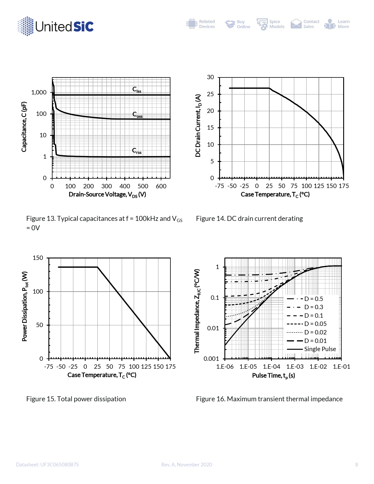 30 1,000 Ciss ) 25 ) A( pF I D ( t, 20 C 100 n , Coss e e rr nc 15 Cu ita 10 n ac ai p r D 10 Ca Crss C 1 D 5 0 0 0 100 200 300 400 500 600 -75 -50 -25 0 25 50 75 100 125 150 175 Drain-Source Voltage, VDS (V) Case Temperature, TC (°C) Figure 13. Typical capacitances at f = 100kHz and VGS Figure 14. DC drain current derating = 0V 150 1 ) W( /W C ot °( P t , 100 n JC io Z q 0.1 , D = 0.5 at e ip nc D = 0.3 ss a i d D = 0.1 D r 50 D = 0.05 e mpeI 0.01 w l o a D = 0.02 P mre D = 0.01 Th Single Pulse 0 0.001 -75 -50 -25 0 25 50 75 100 125 150 175 1.E-06 1.E-05 1.E-04 1.E-03 1.E-02 1.E-01 Case Temperature, TC (°C) Pulse Time, tp (s) Figure 15. Total power dissipation Figure 16. Maximum transient thermal impedance Datasheet: UF3C065080B7S Rev. A, November 2020 8