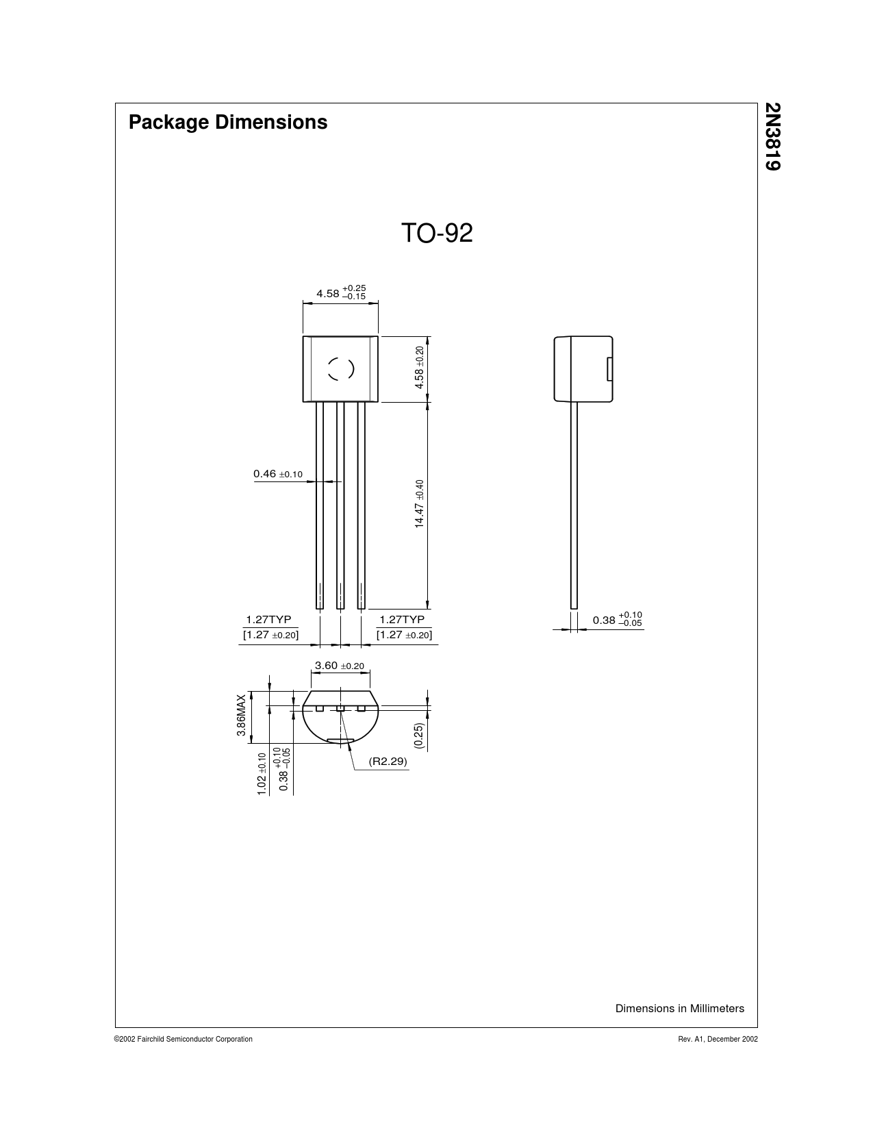 TO-92 +0.25 4.58 –0.15 ±0.20 4.58 0.46 ±0.10 ±0.40 14.47 1.27TYP 1.27TYP +0.10 0.38 –0.05 [1.27 ±0.20] [1.27 ±0.20] 3.60 ±0.20 3.86MAX (0.25) (R2.29) ±0.10 +0.10 –0.05 1.02 0.38 Dimensions in Millimeters ©2002 Fairchild Semiconductor Corporation Rev. A1, December 2002