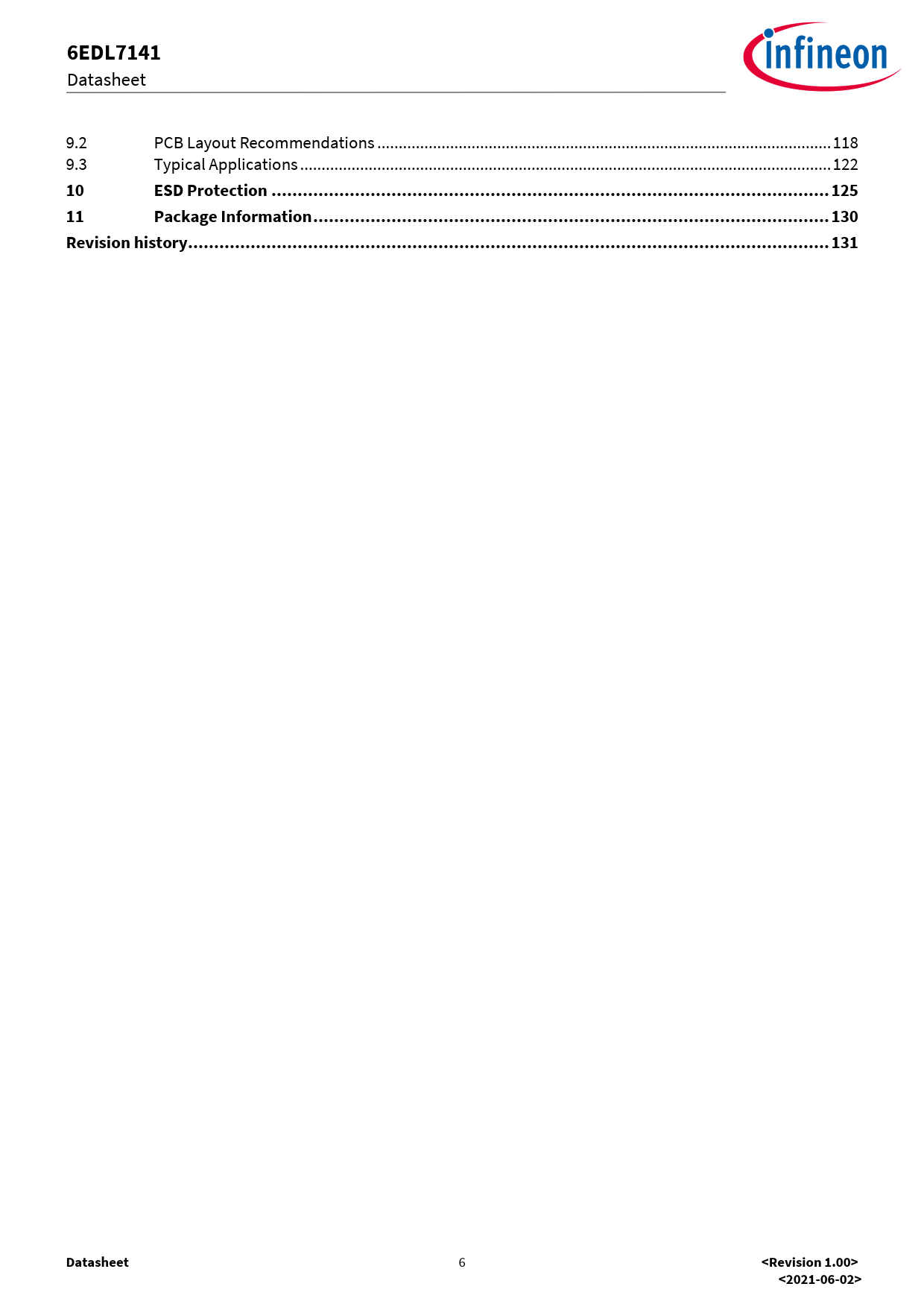 link to page 118 link to page 122 link to page 125 link to page 130 link to page 131 6EDL7141 Datasheet 9.2 PCB Layout Recommendations .. 118 9.3 Typical Applications .. 122 10ESD Protection ... 12511Package Information ... 130Revision history ... 131Datasheet 6 <Revision 1.00><2021-06-02> Document Outline Product Feature Summary Potential Applications Product Description System Block Diagram Package Description 1 Pin Configuration 1.1 Pin Assignment 1.2 Pin Definitions and Functions 2 General Product Characteristics 2.1 Absolute Maximum Ratings 2.2 Recommended Operating Conditions 2.3 ESD Robustness 2.4 Thermal Resistance 2.5 Electrical Characteristics 2.6 Electrical Characteristic Graphs 3 Product Features 3.1 Functional Block Diagram 3.2 PWM Modes 3.2.1 PWM with 6 Independent Inputs – 6PWM 3.2.2 PWM with 3 Independent Inputs – 3PWM 3.2.3 PWM with 1 Input and Commutation Pattern – 1PWM 3.2.4 PWM with 1 Input and Commutation with Hall Sensor Inputs – 1PWM with Hall Sensors 3.2.5 PWM with 1 Input and Commutation with Hall Sensor Inputs and Alternating Recirculation – 1PWM with Hall Sensors and Alternating Recirculation 3.2.6 PWM Braking Modes 3.2.7 Dead Time Insertion 3.3 Integrated Three Phase Gate Driver 3.3.1 Gate Driver Architecture 3.3.2 Slew Rate Control 3.3.2.1 Slew Rate Control Parameters and Usage 3.3.3 Gate Driver Voltage Programmability 3.4 Charge Pump Configuration 3.4.1 Charge Pump Clock Frequency Selection 3.4.2 Charge Pump Clock Spread Spectrum Feature 3.4.3 Charge Pump Pre-Charge for VCCLS 3.4.4 Charge Pump Tuning 3.4.5 Gate Driver and Charge Pumps Protections 3.4.5.1 VCCLS Under-Voltage Lock-Out (VCCLS UVLO) 3.4.5.2 VCCHS Under-Voltage Lock-Out (VCCLS UVLO) 3.4.5.3 Floating Gate Strong Pull Down 3.5 Power Supply System 3.5.1 Synchronous Buck Converter Description 3.5.1.1 Buck Converter Output Voltage Dependency on PVCC_SETPT 3.5.1.2 Synchronous Buck Converter Protections 3.5.2 DVDD Linear Regulator 3.5.2.1 DVDD Linear Regulator OCP 3.6 Current Sense Amplifiers 3.6.1 RDSON Sensing Mode vs Leg Shunt Mode 3.6.2 Current Shunt Amplifier Timing Mode 3.6.3 Current Shunt Amplifier Blanking Time 3.6.4 Current Sense Amplifier Offset Generation: Internal or External (VREF pin) 3.6.5 Overcurrent Comparators and DAC for Current Sense Amplifiers 3.6.5.1 OCP Use Cases 3.6.5.2 OCP Fault Reporting 3.6.5.3 OCP Fault Latching 3.6.5.4 PWM Truncation 3.6.6 Current Sense Amplifier Gain Selection 3.6.7 Current Sense Amplifier DC Calibration 3.6.8 Auto-Zero Compensation of Current Sense Amplifier 3.6.8.1 Internal Auto-Zero 3.6.8.2 External Auto-Zero Synchronization via CS_GAIN/AZ Pin 3.6.8.3 External Auto-Zero Synchronization via CS_GAIN/AZ Pin with Enhanced Sensing 3.7 Hall Comparators 3.8 Watchdog Timers 3.8.1 Buck converter watchdog 3.8.2 General Purpose Watchdog 3.8.3 Locked-Rotor Protection Watchdog Timer 3.9 Multi-Function Pins 3.9.1 EN_DRV Pin 3.9.2 VSENSE/nBRAKE Pin 3.9.3 CS_GAIN/AZ Pin 3.10 ADC Module-Analog to Digital Converter 3.10.1 ADC Measurement Sequencing and On Demand Conversion 3.10.2 Die Temperature Sensor 4 Device Start-Up 4.1 Power Supply Start-Up 4.2 Gate Driver and CSAMP Start-up 5 Device Functional States 6 Protections and Faults Handling 7 Device Programming-OTP and SPI interface 7.1.1 OTP User Programming Procedure: Loading Custom Default Values 7.1.2 SPI Communication 7.1.2.1 SPI Communication Example 8 Register Map 8.1 Device Programmability 8.2 Register Map Faults Status Register Temperature Status Register Power Supply Status Register Functional Status Register OTP Status Register ADC Status Register Charge Pumps Status Register Device ID Register Faults Clear Register Power Supply Configuration Register ADC Configuration Register PWM Configuration Register Sensor Configuration Register Watchdog Configuration Register Watchdog Configuration Register 2 Gate Driver Current Control Register Gate Driver Pre-Charge Current Control Register TDRIVE Source Control Register TDRIVE Sink Control Register Dead Time Register Charge Pump Configuration Register Current Sense Amplifier Configuration Register Current Sense Amplifier Configuration Register 2 OTP Program Register 9 Application Description 9.1 Recommended External Components 9.2 PCB Layout Recommendations 9.3 Typical Applications 10 ESD Protection 11 Package Information Revision history
