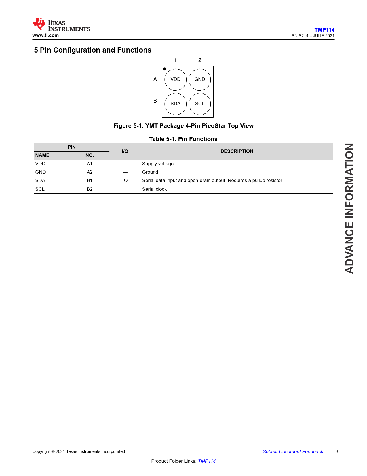 | 页数 / 页 | 43 / 3 — TMP114. www.ti.com. 5 Pin Configuration and Functions. Figure 5-1. YMT … |