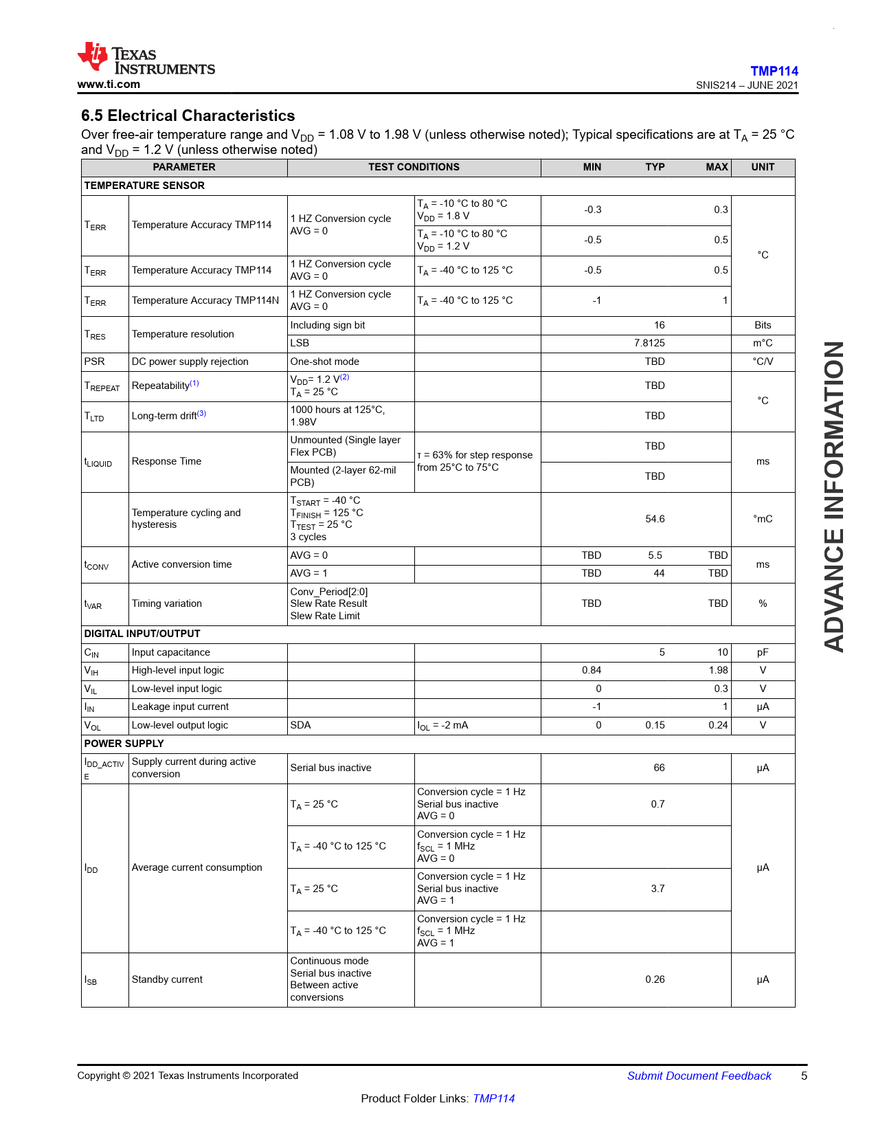 TMP114. www.ti.com. 6.5 Electrical Characteristics. PARAMETER. TEST CONDITIONS. MIN. TYP. MAX. UNIT. TEMPERATURE SENSOR. TION. NCE INFO