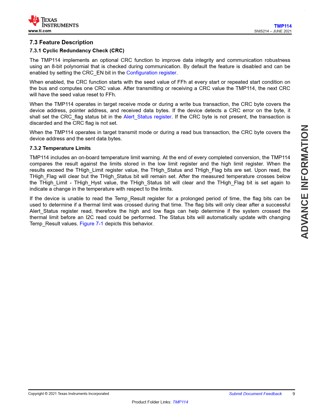 TMP114. www.ti.com. 7.3 Feature Description 7.3.1 Cyclic Redundancy Check (CRC). TION. 7.3.2 Temperature Limits. NCE INFO. V AD