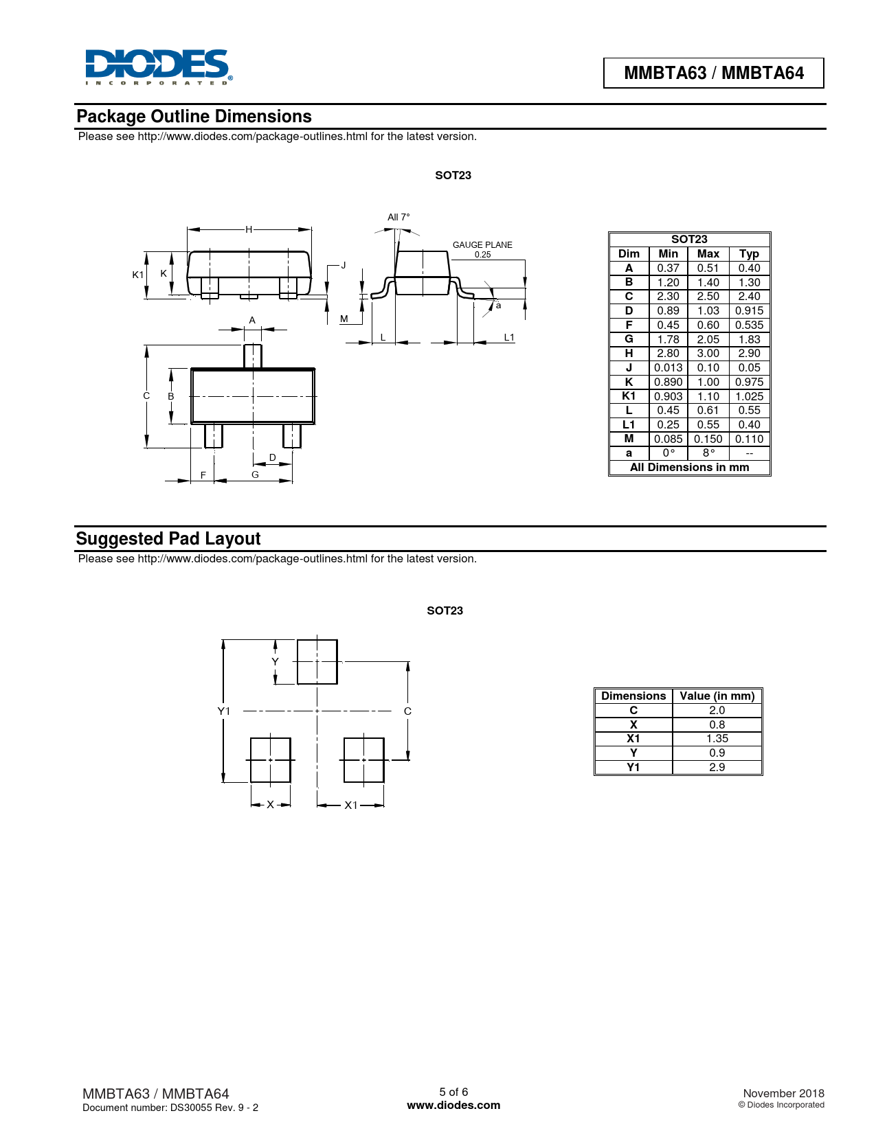 MMBTA63 / MMBTA64. Package Outline Dimensions. SOT23. Dim. Min. Max. Typ. All Dimensions in mm. Suggested Pad Layout