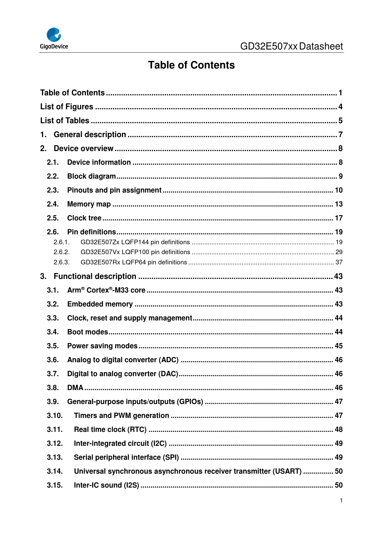 link to page 2 link to page 5 link to page 6 link to page 8 link to page 9 link to page 9 link to page 10 link to page 11 link to page 14 link to page 18 link to page 20 link to page 20 link to page 30 link to page 38 link to page 44 link to page 44 link to page 44 link to page 45 link to page 45 link to page 46 link to page 47 link to page 47 link to page 47 link to page 48 link to page 48 link to page 49 link to page 50 link to page 50 link to page 51 link to page 51 GD32E507xx Datasheet Table of ContentsTable of Contents ... 1List of Figures .. 4List of Tables .. 51.General description ... 72.Device overview ... 82.1.Device information .. 82.2.Block diagram .. 92.3.Pinouts and pin assignment ... 102.4.Memory map .. 132.5.Clock tree ... 172.6.Pin definitions .. 19 2.6.1. GD32E507Zx LQFP144 pin definitions .. 19 2.6.2. GD32E507Vx LQFP100 pin definitions .. 29 2.6.3. GD32E507Rx LQFP64 pin definitions .. 37 3.Functional description .. 433.1.Arm® Cortex®-M33 core ... 433.2.Embedded memory ... 433.3.Clock, reset and supply management .. 443.4.Boot modes .. 443.5.Power saving modes ... 453.6.Analog to digital converter (ADC) .. 463.7.Digital to analog converter (DAC) ... 463.8.DMA .. 463.9.General-purpose inputs/outputs (GPIOs) .. 473.10.Timers and PWM generation ... 473.11.Real time clock (RTC) .. 483.12.Inter-integrated circuit (I2C) .. 493.13.Serial peripheral interface (SPI) .. 493.14.Universal synchronous asynchronous receiver transmitter (USART) ... 503.15.Inter-IC sound (I2S) .. 50 1 Document Outline Table of Contents List of Figures List of Tables 1. General description 2. Device overview 2.1. Device information 2.2. Block diagram 2.3. Pinouts and pin assignment 2.4. Memory map 2.5. Clock tree 2.6. Pin definitions 2.6.1. GD32E507Zx LQFP144 pin definitions 2.6.2. GD32E507Vx LQFP100 pin definitions 2.6.3. GD32E507Rx LQFP64 pin definitions 3. Functional description 3.1. Arm® Cortex®-M33 core 3.2. Embedded memory 3.3. Clock, reset and supply management 3.4. Boot modes 3.5. Power saving modes 3.6. Analog to digital converter (ADC) 3.7. Digital to analog converter (DAC) 3.8. DMA 3.9. General-purpose inputs/outputs (GPIOs) 3.10. Timers and PWM generation 3.11. Real time clock (RTC) 3.12. Inter-integrated circuit (I2C) 3.13. Serial peripheral interface (SPI) 3.14. Universal synchronous asynchronous receiver transmitter (USART) 3.15. Inter-IC sound (I2S) 3.16. Universal serial bus High-Speed interface (USBHS) 3.17. Controller area network (CAN) 3.18. Ethernet (ENET) 3.19. External memory controller (EXMC) 3.20. Comparators (CMP) 3.21. Trigonometric Math Unit (TMU) 3.22. Super High-Resolution Timer (SHRTIMER) 3.23. Serial/Quad Parallel Interface (SQPI) 3.24. Debug mode 3.25. Package and operation temperature 4. Electrical characteristics 4.1. Absolute maximum ratings 4.2. Operating conditions characteristics 4.3. Power consumption 4.4. EMC characteristics 4.5. Power supply supervisor characteristics 4.6. Electrical sensitivity 4.7. External clock characteristics 4.8. Internal clock characteristics 4.9. PLL characteristics 4.10. Memory characteristics 4.11. NRST pin characteristics 4.12. GPIO characteristics 4.13. Temperature sensor characteristics 4.14. ADC characteristics 4.15. DAC characteristics 4.16. Comparators characteristics 4.17. Trigonometric Math Unit (TMU) characteristics 4.18. I2C characteristics 4.19. SPI characteristics 4.20. I2S characteristics 4.21. USART characteristics 4.22. CAN characteristics 4.23. USBHS characteristics 4.24. EXMC characteristics 4.25. Serial/Quad Parallel Interface (SQPI) characteristics 4.26. Super High-Resolution Timer (SHRTIMER) characteristics 4.27. TIMER characteristics 4.28. WDGT characteristics 4.29. Parameter condition 5. Package information 5.1. LQFP144 package outline dimensions 5.2. LQFP100 package outline dimensions 5.3. LQFP64 package outline dimensions 6. Ordering information 7. Revision history