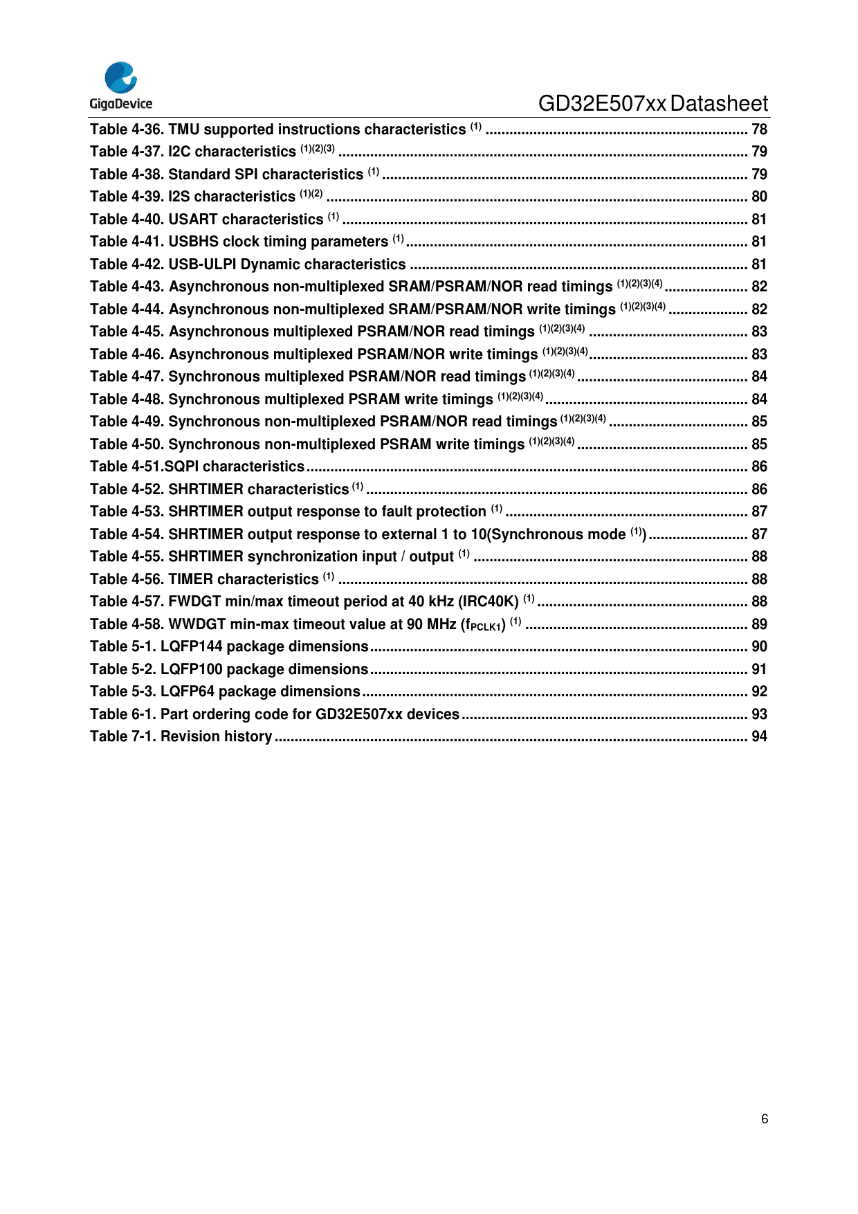 Table 4-36. TMU supported instructions characteristics (1) .. 78 Table 4-37. I2C characteristics (1)(2)(3) ... 79 Table 4-38. Standard SPI characteristics (1) .. 79 Table 4-39. I2S characteristics (1)(2) .. 80 Table 4-40. USART characteristics (1) .. 81 Table 4-41. USBHS clock timing parameters (1) .. 81 Table 4-42. USB-ULPI Dynamic characteristics ... 81 Table 4-43. Asynchronous non-multiplexed SRAM/PSRAM/NOR read timings (1)(2)(3)(4) ... 82 Table 4-44. Asynchronous non-multiplexed SRAM/PSRAM/NOR write timings (1)(2)(3)(4) .. 82 Table 4-45. Asynchronous multiplexed PSRAM/NOR read timings (1)(2)(3)(4) .. 83 Table 4-46. Asynchronous multiplexed PSRAM/NOR write timings (1)(2)(3)(4) .. 83 Table 4-47. Synchronous multiplexed PSRAM/NOR read timings (1)(2)(3)(4) ... 84 Table 4-48. Synchronous multiplexed PSRAM write timings (1)(2)(3)(4) ... 84 Table 4-49. Synchronous non-multiplexed PSRAM/NOR read timings (1)(2)(3)(4) ... 85 Table 4-50. Synchronous non-multiplexed PSRAM write timings (1)(2)(3)(4) ... 85 Table 4-51.SQPI characteristics ... 86 Table 4-52. SHRTIMER characteristics (1) .. 86 Table 4-53. SHRTIMER output response to fault protection (1) ... 87 Table 4-54. SHRTIMER output response to external 1 to 10(Synchronous mode (1)) ... 87 Table 4-55. SHRTIMER synchronization input / output (1) ... 88 Table 4-56. TIMER characteristics (1) ... 88 Table 4-57. FWDGT min/max timeout period at 40 kHz (IRC40K) (1) ... 88 Table 4-58. WWDGT min-max timeout value at 90 MHz (fPCLK1) (1) .. 89 Table 5-1. LQFP144 package dimensions ... 90 Table 5-2. LQFP100 package dimensions ... 91 Table 5-3. LQFP64 package dimensions ... 92 Table 6-1. Part ordering code for GD32E507xx devices .. 93 Table 7-1. Revision history ... 94