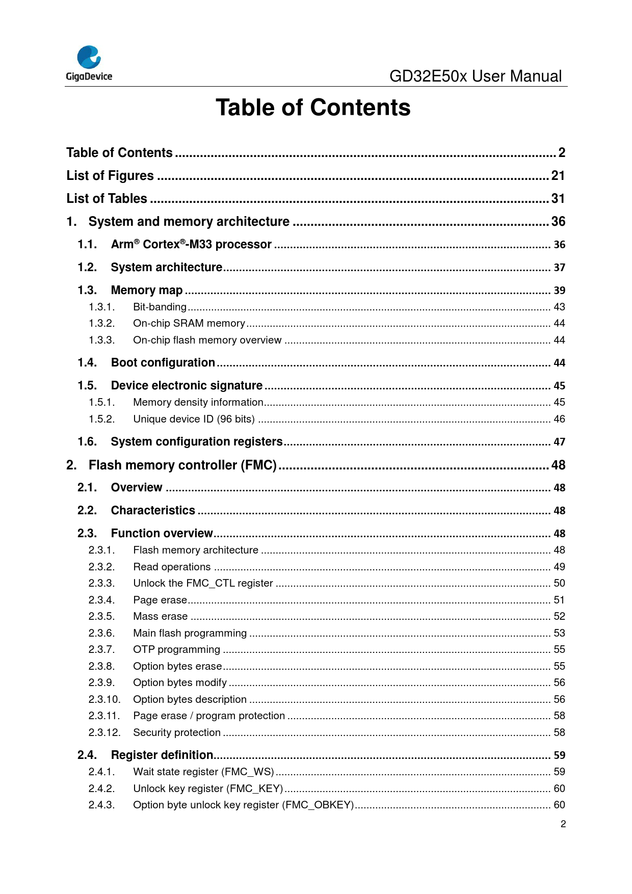Table of Contents Table of Contents ... 2 List of Figures .. 21 List of Tables .. 31 1. System and memory architecture .. 36 1.1. Arm® Cortex®-M33 processor ... 36 1.2. System architecture ... 37 1.3. Memory map ... 39