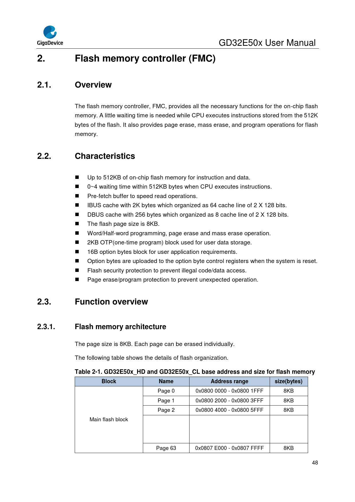 Flash memory controller (FMC). 2.1. Overview. 2.2. Characteristics. 2.3. Function overview. 2.3.1. Flash memory architecture